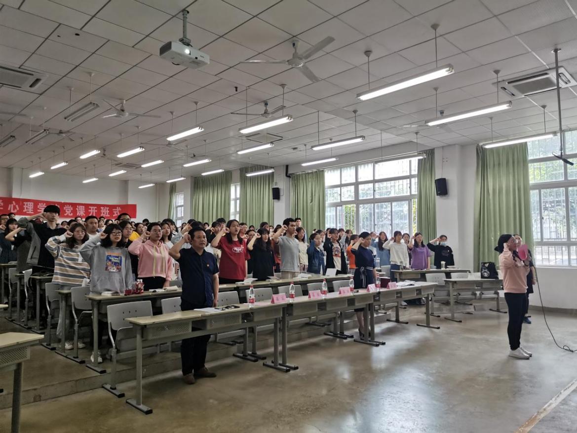 首先,由谢小芬老师主持开班仪式,全体起立奏唱国歌,谢小芬老师向学员们强调了党课培训的重要性并要求学员们认真对待。接着,由党委办公室陈芳老师宣读党课纪律要求,陈芳老师强调三点:一是考勤纪律,不迟到不早退,不随意请假;二是课堂纪律,认真听讲;三是考试纪律,认真备考,诚信应考。随后由本科生2020级心理学类一班吴韵杉同学代表本次党课学员们进行发言。最后,面对党旗,在本科生辅导员王丽君老师的带领下,全体的党员、预备党员、发展对象和积极分子庄严宣誓,表达入党的坚定决心。