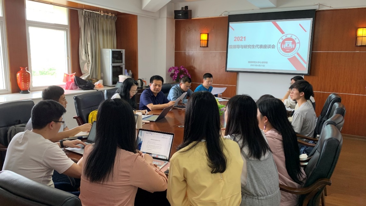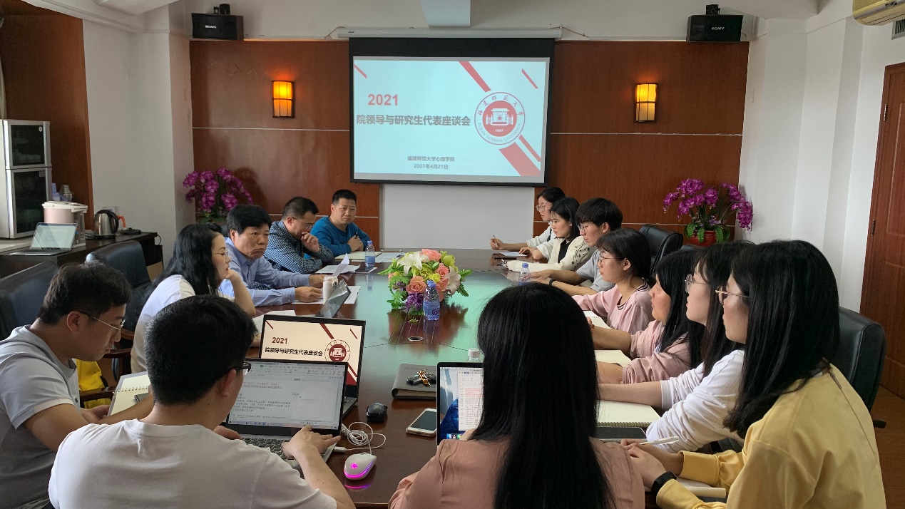 4月21日下午,我院在人文楼七楼会议室召开院领导与研究生代表座谈会。院长连榕、院党委书记张承东、院党委副书记张本钰、院务委员张锦坤,以及各年级各专业研究生代表参加了座谈会。