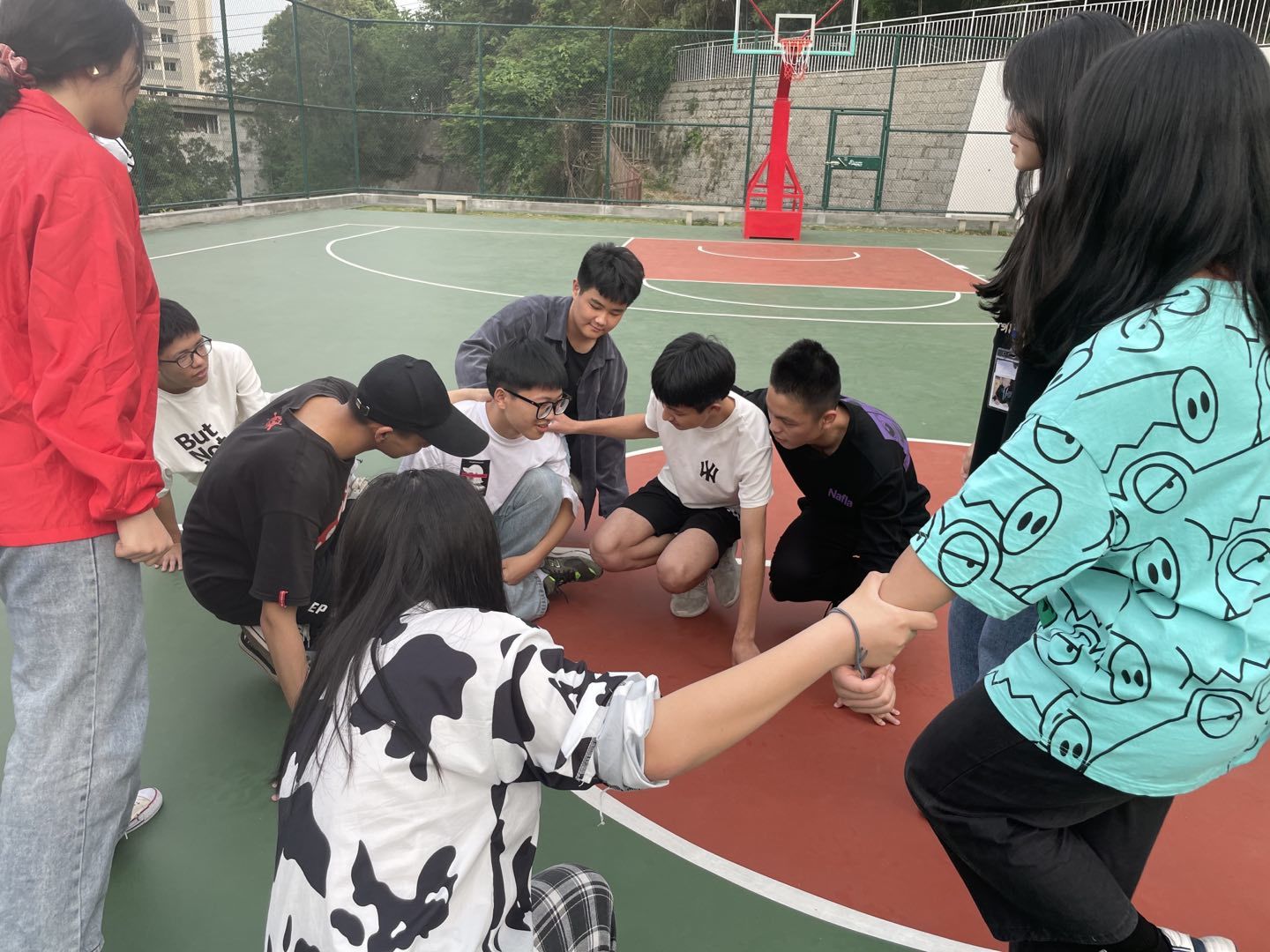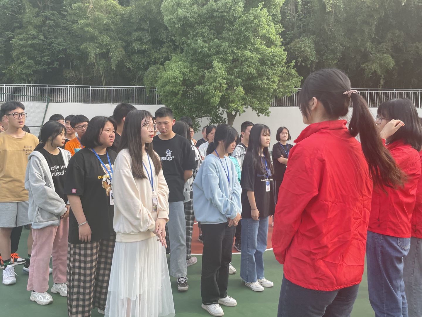 团体辅导活动在校园篮球场内举行,在场的学生们在主训和分教官的带领下,同学们褪去了原先的拘谨,场内也活跃起来。通过团队组建、无官算盘和七手八脚等活动让队员内的情感更紧密,他们发挥智慧、共同商讨,在协商中明确每个人在团体中扮演不同角色的意义。