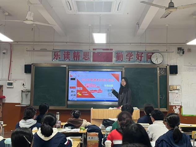 我院“福师泉韵实验星播队”踏入熟悉的高中校园,开展“我为母校代言”社会实践活动,队员们受到了母校师生的热烈欢迎。宣讲会现场,精心制作的PPT展示着福建师范大学的如画校园、深厚底蕴与强劲实力,从历史悠久的教学楼到前沿高端的实验室,从丰富多彩的社团活动到硕果累累的竞赛佳绩,全方位勾勒出大学的精彩轮廓。宣讲突破传统模式,融入短视频、VR全景校园展示等新媒体元素,让学弟学妹身临其境地感受大学魅力;还设置“梦想明信片”环节,鼓励大家写下目标心愿,封存至高考后开启,为奋斗之路添一抹仪式感。队员郑好感慨:“这次宣讲,是感恩之行,更是自我成长。”队员庄伊涵感慨:“看到学弟学妹眼中的光,仿佛看到曾经的自己,希望能成为他们逐梦路上的引路人,未来我们大学见!”