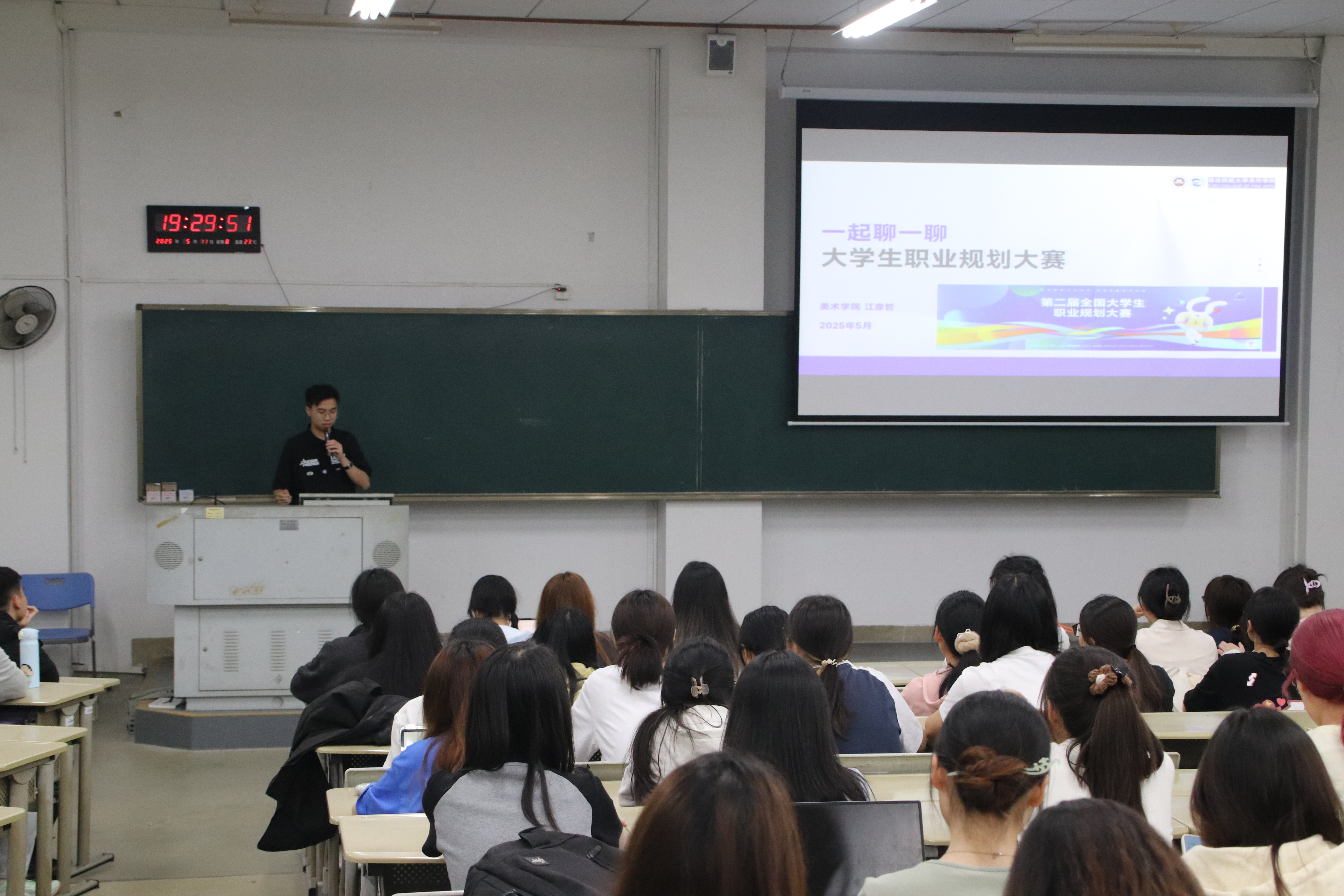 为增强大学生职业规划意识,推动“职业规划+学风建设”双向融合,营造好学、勤学、乐学的学习氛围,我院于5月11日在立诚1-205举办职业规划大赛经验分享会。本次活动邀请到第二届全国大学生职业规划大赛成长赛道高教组金奖获得者、美术学院江彦哲同学进行分享,由院团委书记郑逸凡主持,2023、2024级全体本科生参加。
