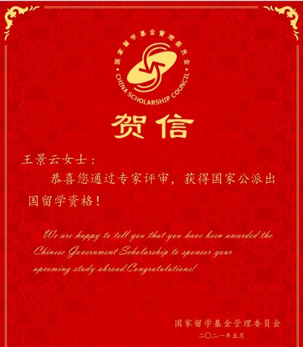 王景云同学计划学习国外先进的技术经验,借鉴国外的研究视野,学成归来后将其运用于我国的青少年心理健康、家校合作、教育等方面,为我国的科研实力贡献自己的力量。
