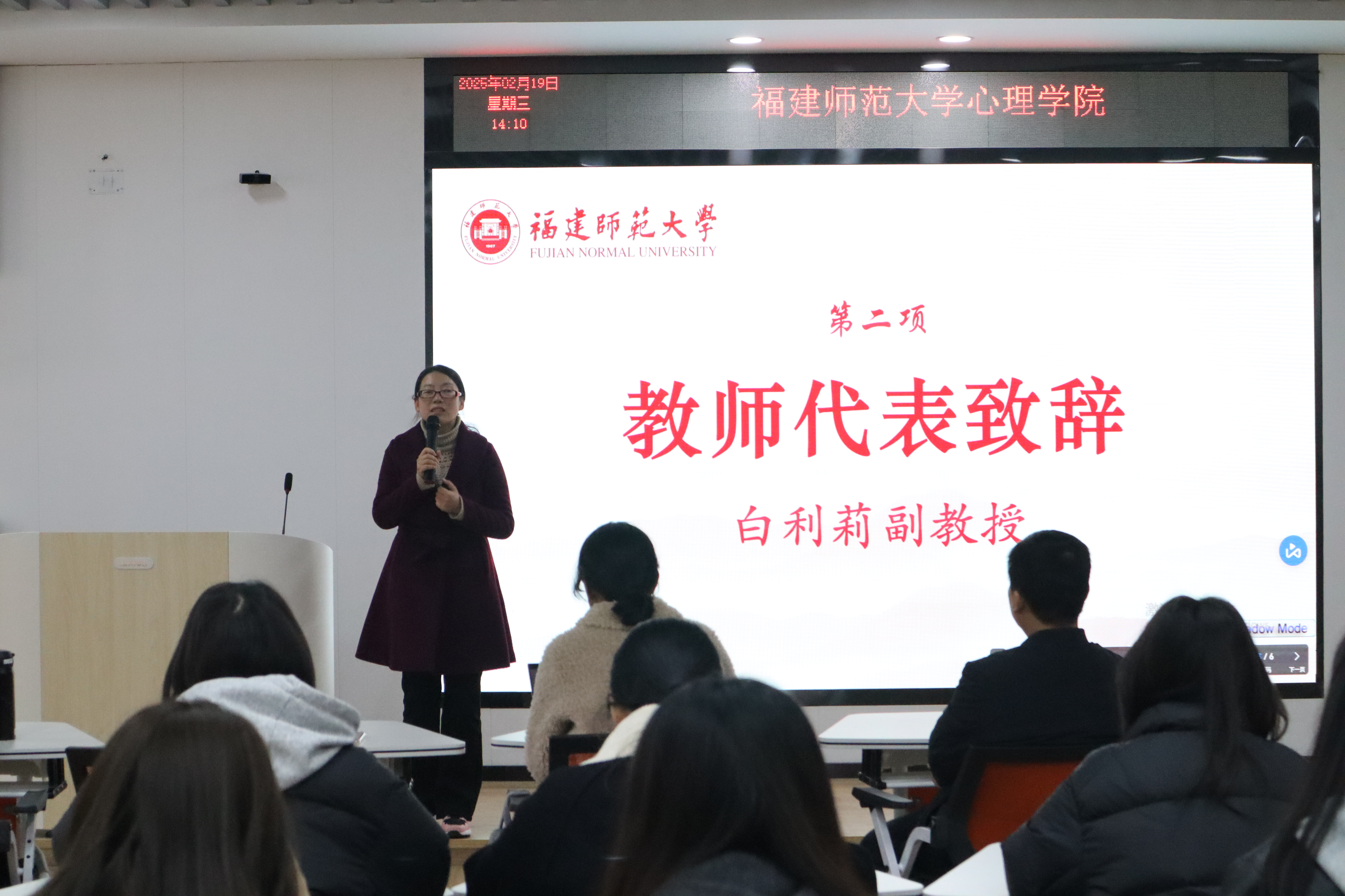 白利莉副教授作为教师代表发言。她结合自身指导经验,建议同学们要牢牢把握本次实习机会,认真对待备课、授课、研讨等教学环节。同时提醒同学们合理使用现代教育技术,但切忌过度依赖,要始终坚持以学生为中心的教学理念。