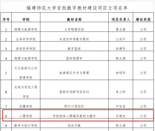 近日,福建师范大学发布《关于公布首批数字教材建设项目立项名单的通知》,经教师申报、学院推荐、专家评审和教务处审核,我院许艳凤副教授的《学校团体心理辅导案例与操作》教材项目成功立项。