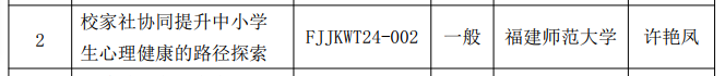 同时,近日许艳凤副教授的“校家社协同提升中小学生心理健康的路径探索”获得福建省教育科学规划基础教育高质量发展专项委托课题立项。