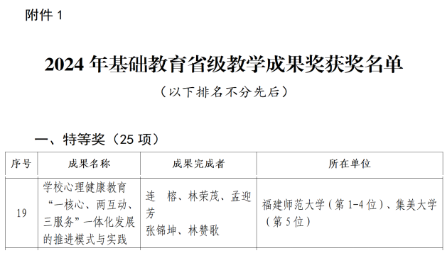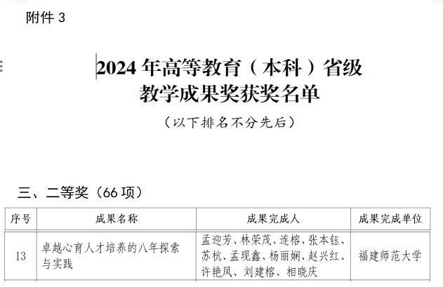 近日,省教育厅公布了2024年省级教学成果奖获奖成果名单,我院连榕教授申报的《学校心理健康教育“一核心、两互动、三服务”一体化发展的推进模式与实践》获基础教育特等奖,孟迎芳教授申报的《卓越心育人才培养的八年探索与实践》获高等教育(本科)二等奖。这是我院建院以来首次在基础教育和高等教育教学成果奖项上取得“双突破”。 据悉,此次省教育厅共计授奖499项教学成果,其中:基础教育省级教学成果奖特等奖25项、一等奖50项、二等奖75项,高等教育(本科)省级教学成果奖特等奖31项、一等奖53项、二等奖66项。我校共18项成果获奖,特等奖6项(基础教育仅我院1项)、一等奖5项、二等奖7项。