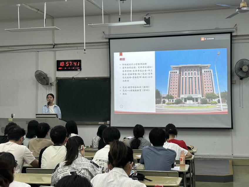 6月8日晚,大学生就业引航员2021级心理学(师范)专业本科生王思琪在笃行1-109教室为2022级全体本科生开展教师招聘经验交流。王思琪同学针对教师招聘的相关流程做了详细介绍,帮助同学们梳理了教师招聘考试的备考时间轴,建议同学们要把握考试时间节点,科学规划,建立“考试台账”,并采用“阶梯式复习法”。