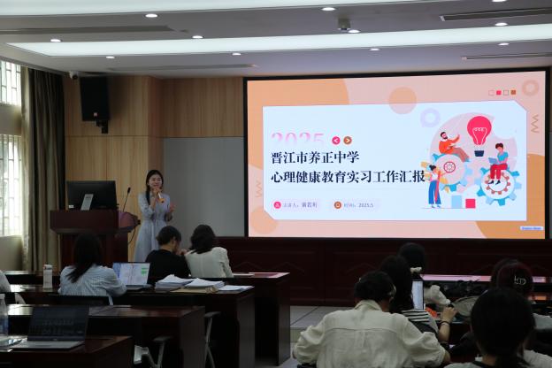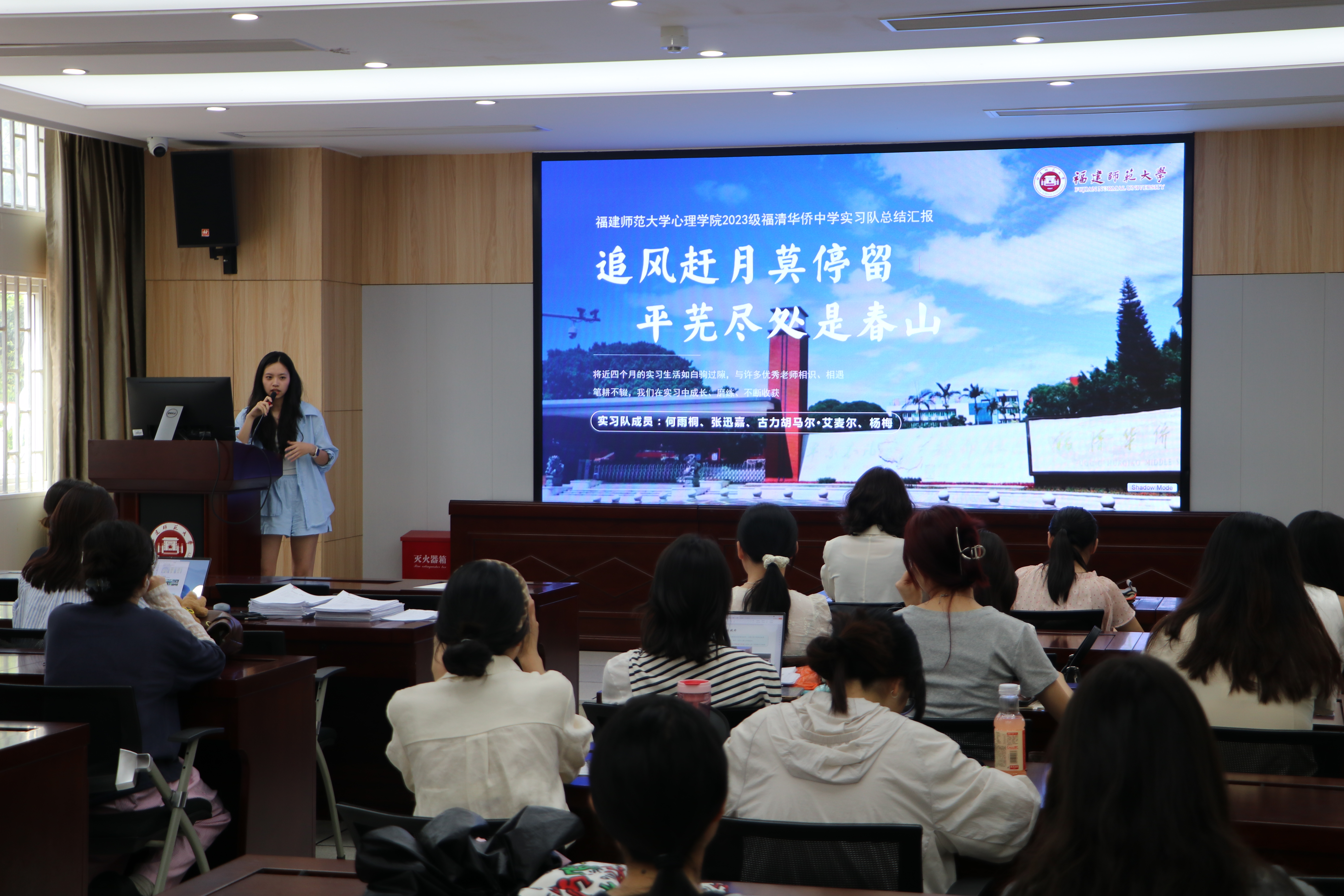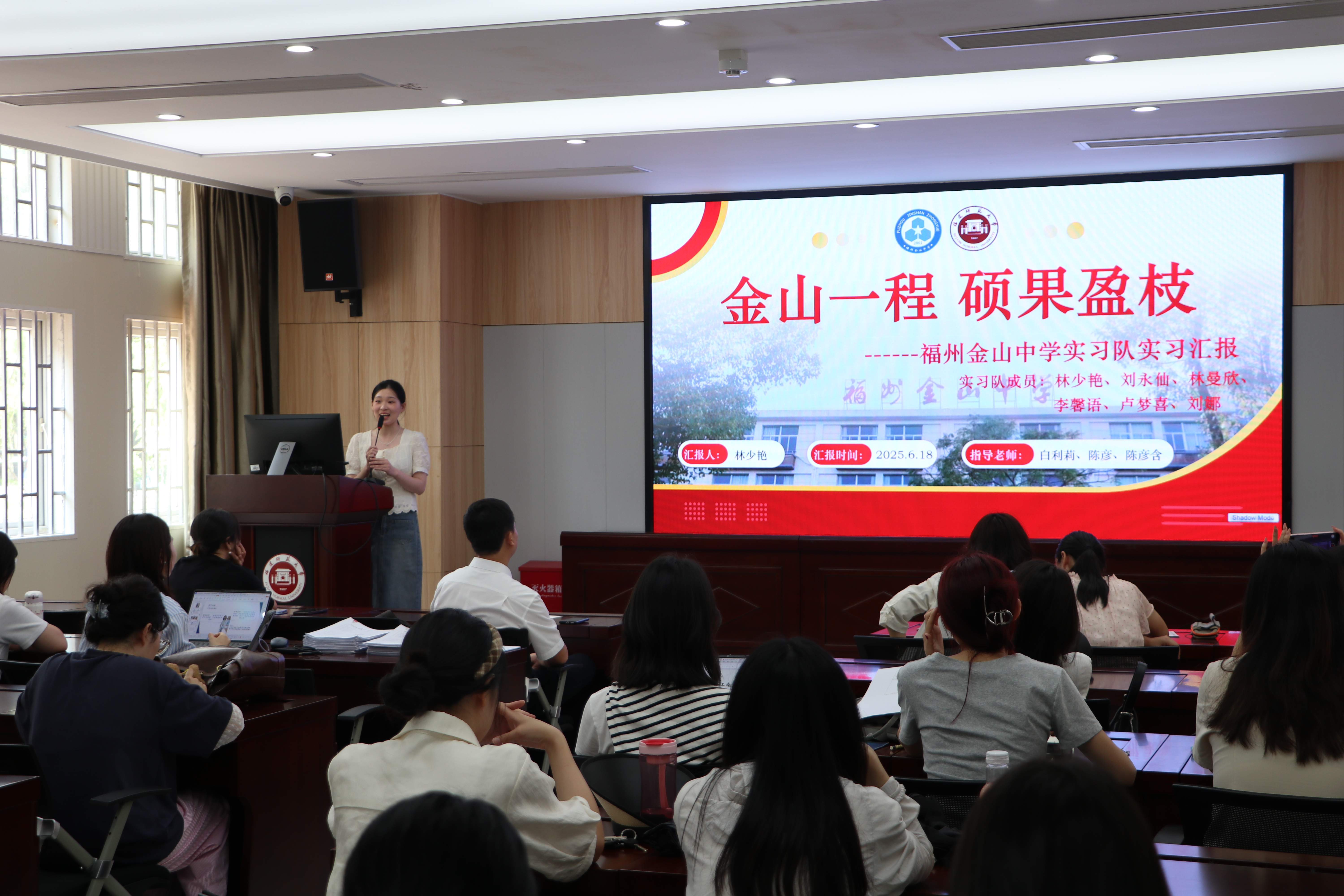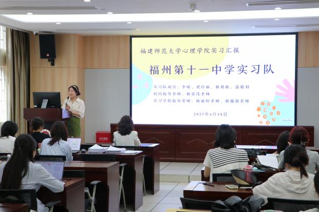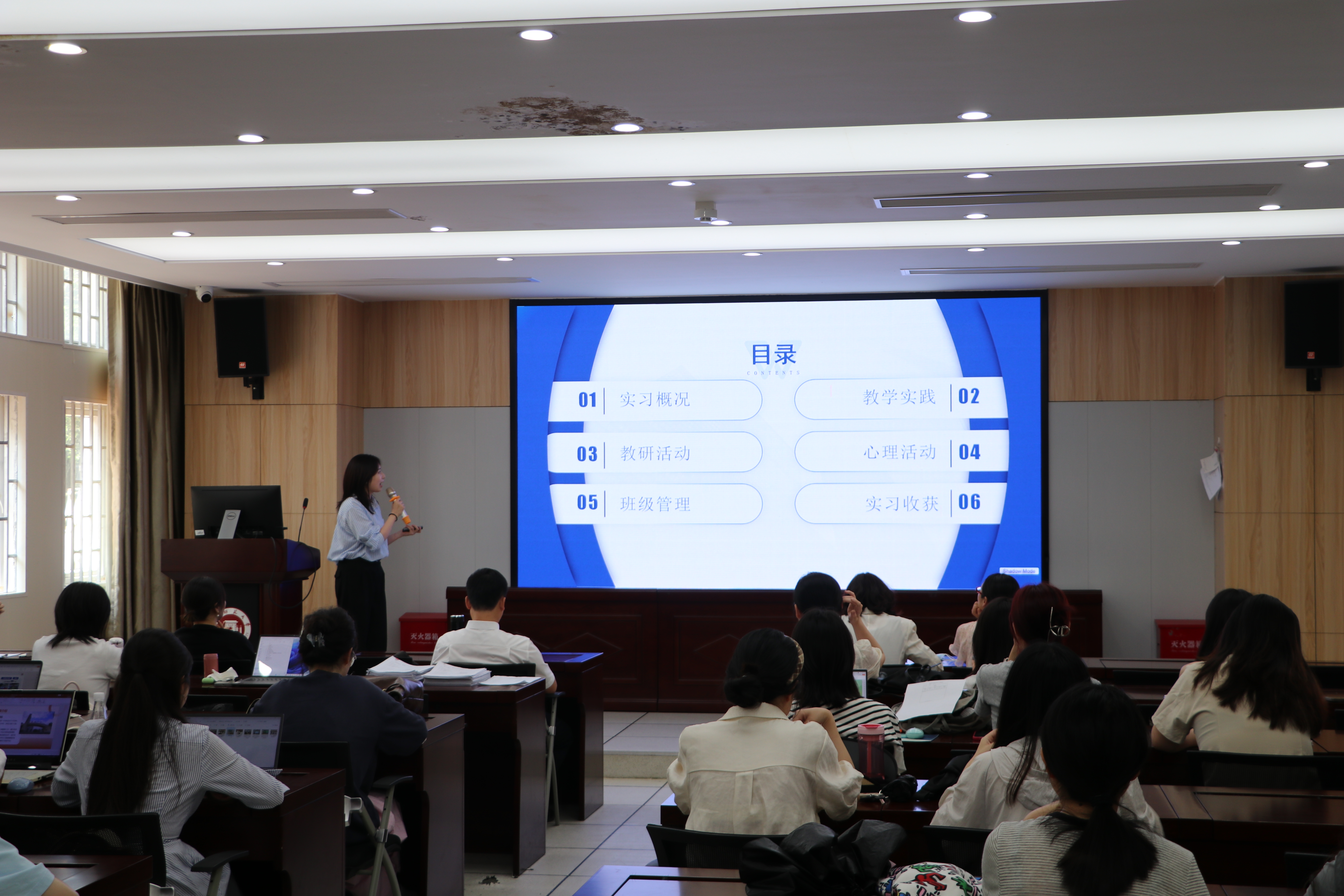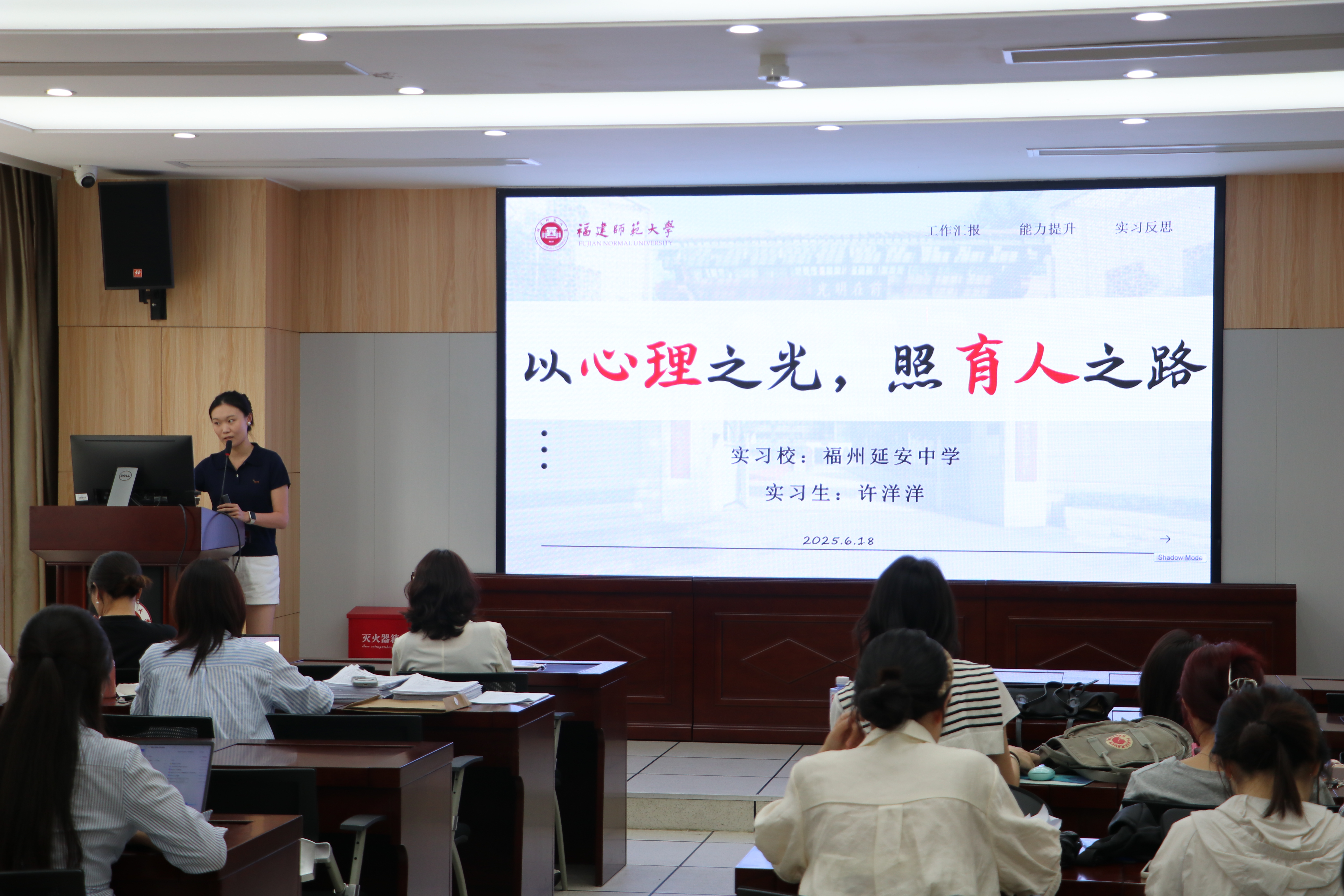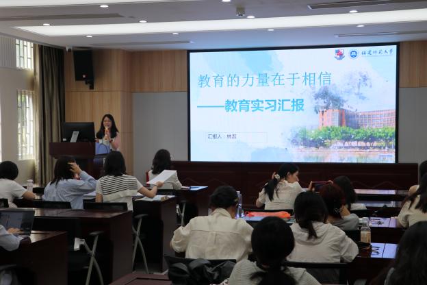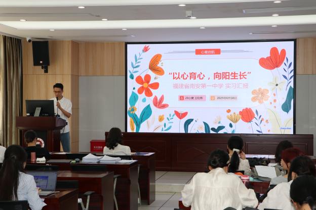 此外,分散实习同学同样汇报了充实的实践成果。王松桦同学在南安第一中学的教育沃土上,亲历“一切为了学生发展”的育人实践,与学校共成长。许洋洋同学于福州延安中学“见贤思齐,止于至善”的校训熏陶下,以专业与爱心守护学生心灵。曾若珩同学在底蕴深厚、设施先进的晋江养正中学,深刻体会“养天地正气,育人间英才”的使命。林淑同学不辞辛劳,将专业知识化作春风,温暖福州三中晋安校区的学生心田,实现自我蜕变。