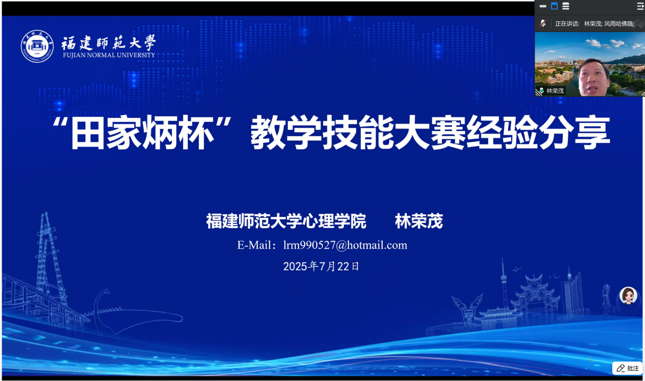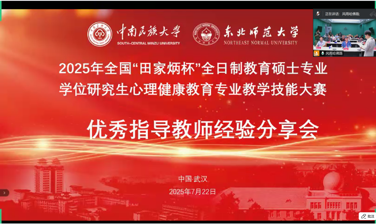 7月22日上午,2025年全国“田家炳杯”全日制教育硕士专业学位研究生心理健康教育专业教学技能大赛启动仪式在武汉中南民族大学举行。受大会组委会邀请,我院副院长、教育硕士(心理健康教育方向)专业负责人林荣茂教授通过线上方式作优秀指导教师经验分享。