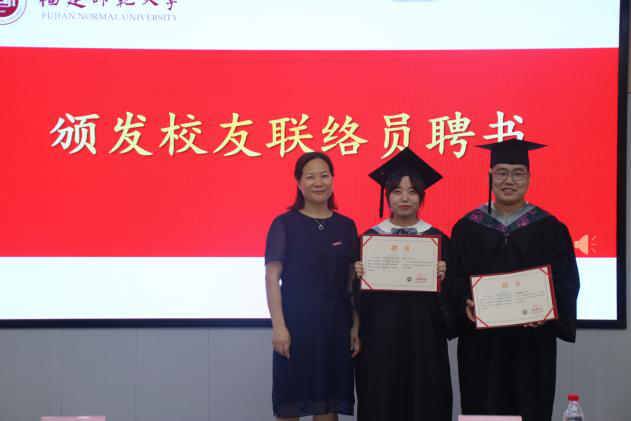 在互赠礼物阶段,院工会主席彭新波老师代表学院和本科毕业生代表互换礼物,现场气氛温馨融洽。紧接着,学院办公室主任余云珠老师为校友联络员张玉同学和万博温同学颁发聘书。