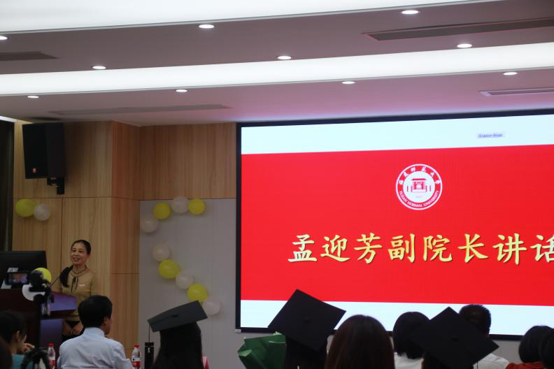 孟迎芳副院长代表学院向毕业生表达了衷心的祝贺,并对到来的学生家长表示热烈的欢迎。其中她强调了“守初心,持真心、存善心”“三心”对于未来生活的重要作用,期待每一位毕业生都前程似锦,活出自己的精彩。
