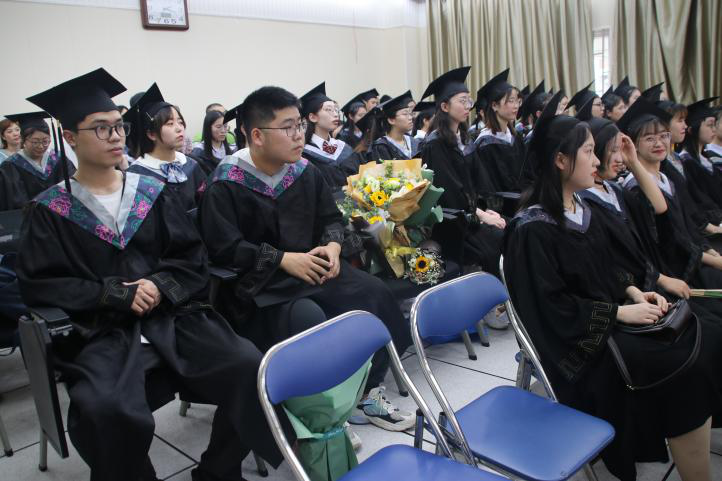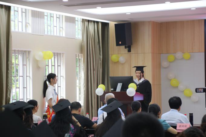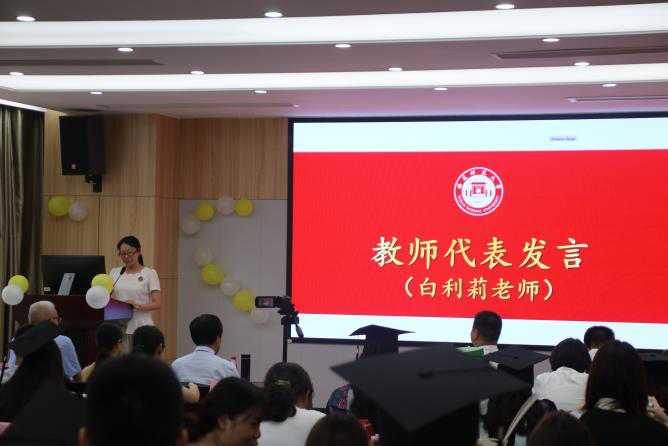 随后,郑含碧同学代表全体毕业生对各位领导老师的栽培和教育致以真挚的谢意,表达了对未来的美好期盼。接着,青年教师、2017级心理学(师范)班主任白利莉老师引用诸位心理学家的理论叮嘱各位毕业生仔细规划未来,认真反思,其中“请我也不会祝愿每一位毕业生在未来的每一天都能够开心幸福,因为变态心理学告诉我们,情绪过度持续高涨的可能是躁狂,更何况,消极情绪也有积极的价值和意义”的真诚话语令在场同学都忍俊不禁,并为之动容。