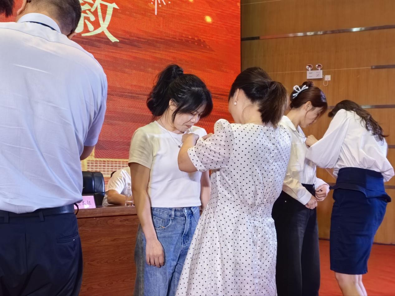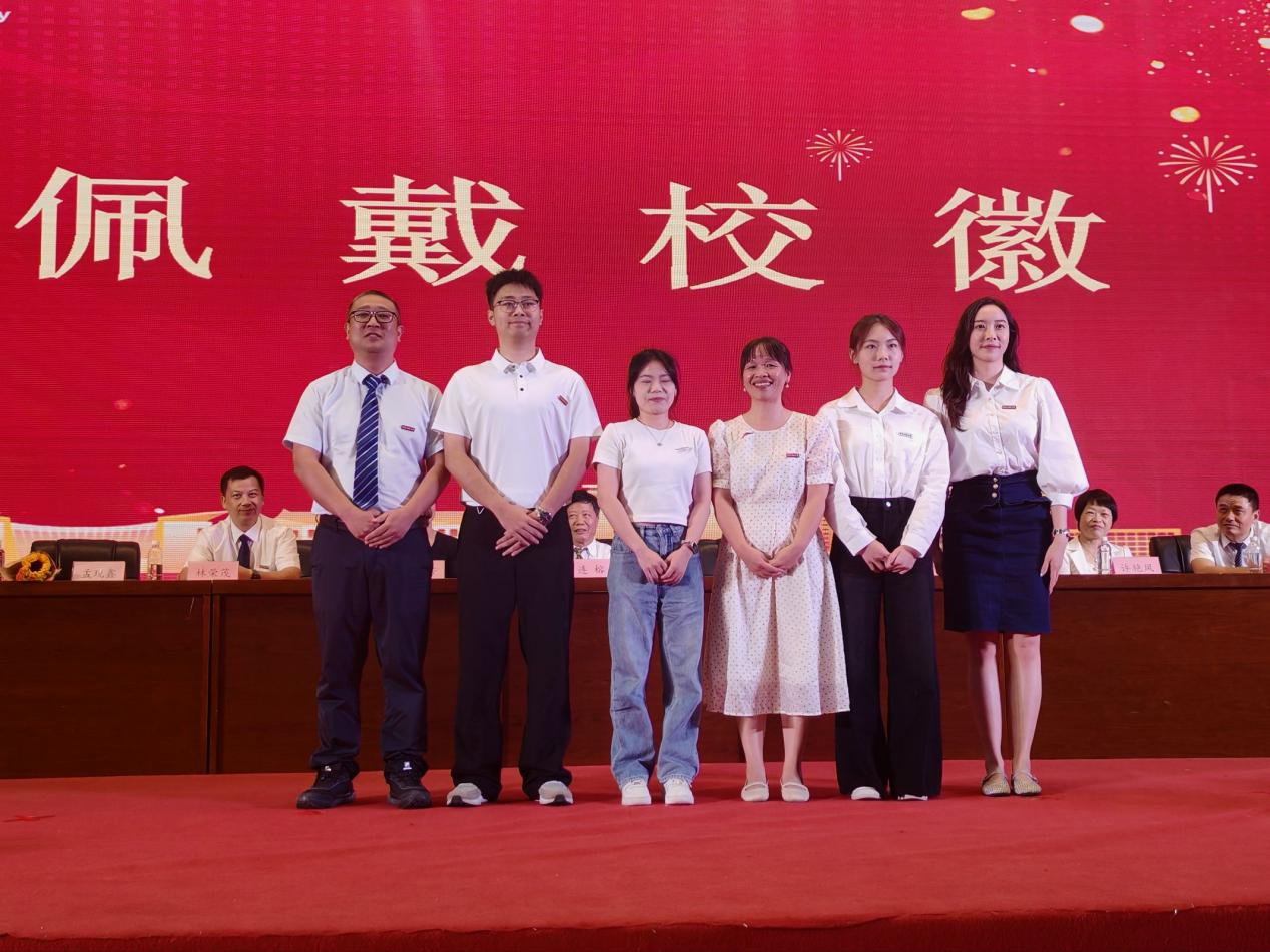 教师代表孟现鑫、杨丽娴、李雨潼老师为新生代表佩戴校徽。