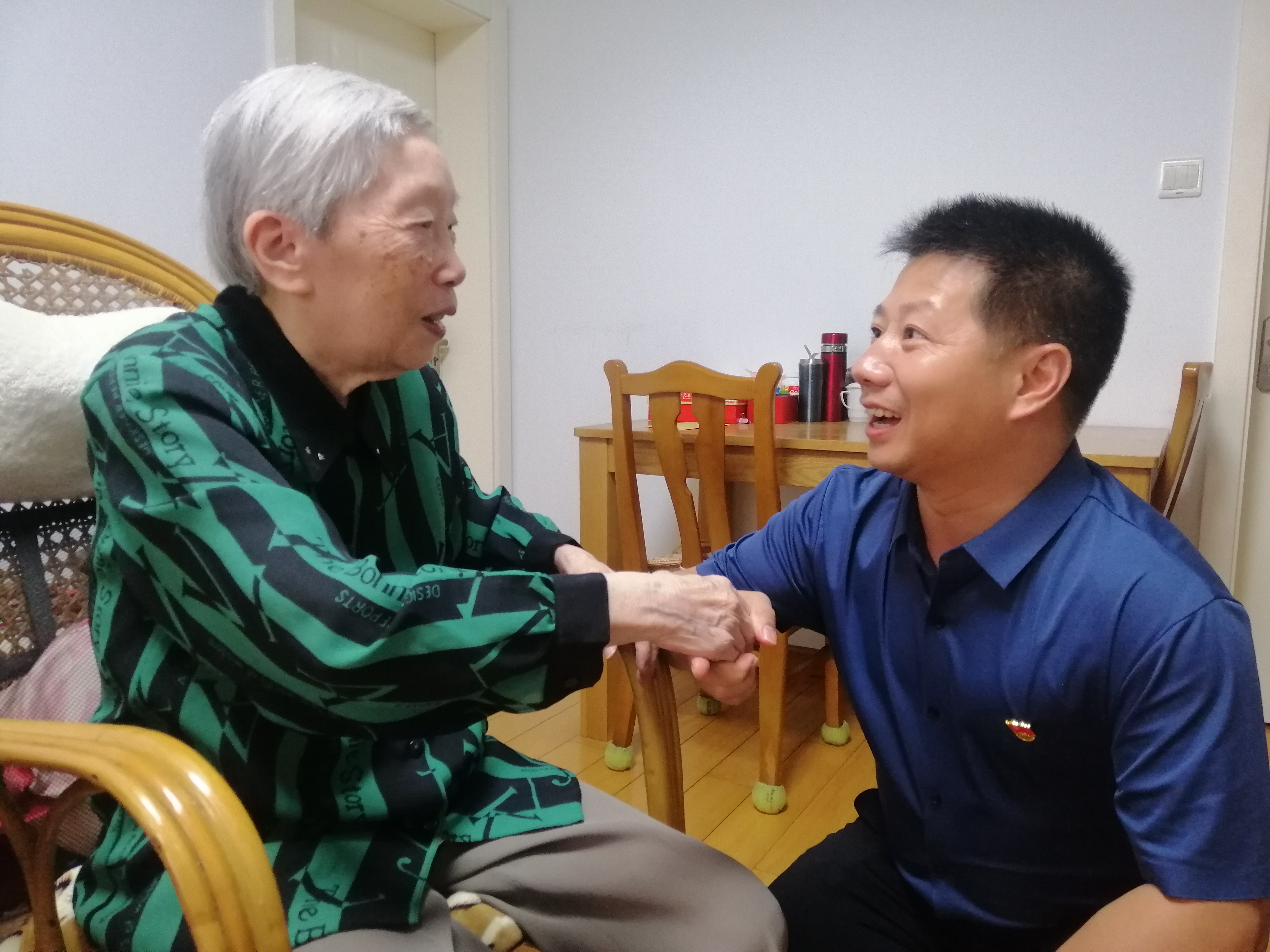 学院党委领导与两位党员亲切交谈,表达对老党员的敬意,特别对陈毓洸同志退休后一直从事我校老师和校友参与革命史料的整理,出版《战斗在黎明前》等多部著作表示由衷的敬意;关切询问日常生活和身体情况。