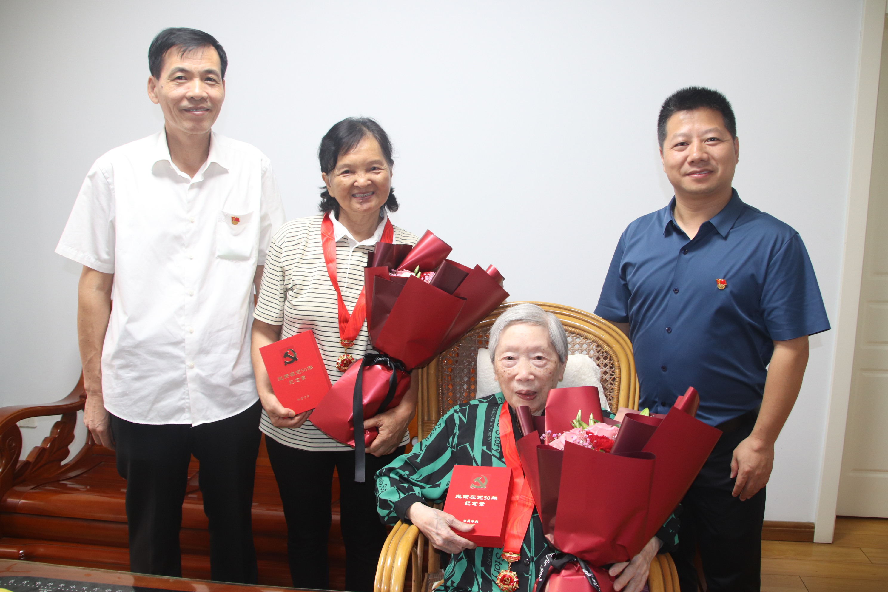 学院党委张本钰副书记(主持工作)、退休党支部叶建鸣书记和党委工作人员一起上门,在陈毓洸同志家中为两位老党员颁发纪念章,并献上鲜花。