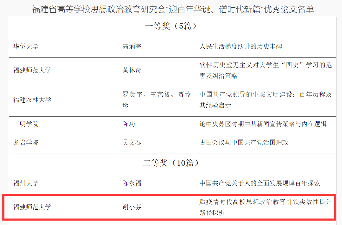 近日,福建省高等学校思想政治教育研究会开展“迎百年华诞、谱时代新篇”优秀论文征集活动,我院辅导员谢小芬老师撰写的论文《后疫情时代高校思想政治教育引领实效性提升路径探析》,经专家匿名评审,获评二等奖。