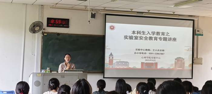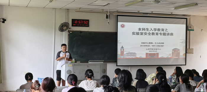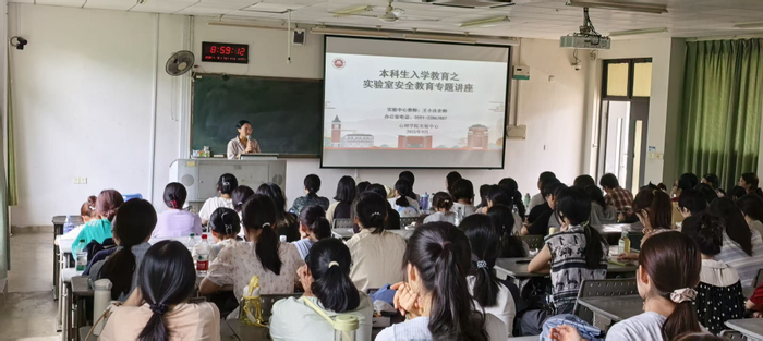 为切实提高心理学院新生实验室安全防范意识与应急处突能力,营造安全、规范、有序的科研教学环境,9月10日,在立诚楼1-303A,我院实验中心王小庆老师为2025级新生带来了一堂生动而深刻的“实验室安全第一课”。本次活动由本科新生班淏钰主持。