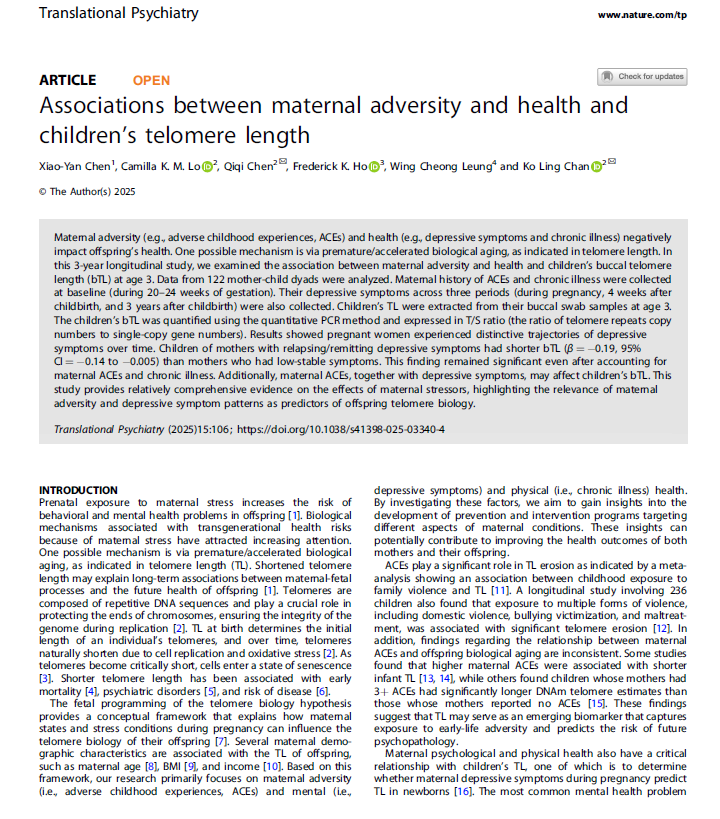 论文信息:Chen, X. Y., Lo, C. K., Chen, Q., Ho, F. K., Leung, W. C., & Chan, K. L*. (2025). Associations between maternal adversity and health and children’s telomere length. Translational Psychiatry, 15(1), 106.