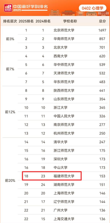 2025 软科中国最好学科排名(心理学)正式发布,我院心理学学科位列全国第18 名,较去年大幅提升 5 个位次,排名进入前20%。
