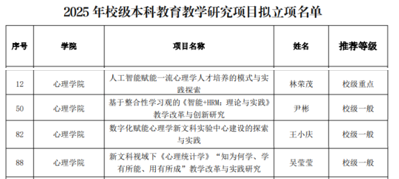 我院林荣茂副院长《人工智能赋能一流心理学人才培养的模式与实践探索》获校级重点立项,尹彬老师《基于整合性学习观的《智能+HRM:理论与实践》 教学改革与创新研究》、王小庆老师《数字化赋能心理学新文科实验中心建设的探索 与实践》、吴莹莹老师《新文科视域下《心理统计学》“知为何学、学有所能、用有所成”教学改革与实践研究》三项获校级一般立项。