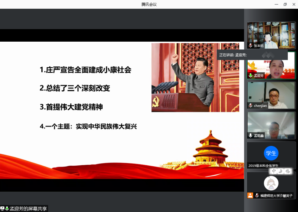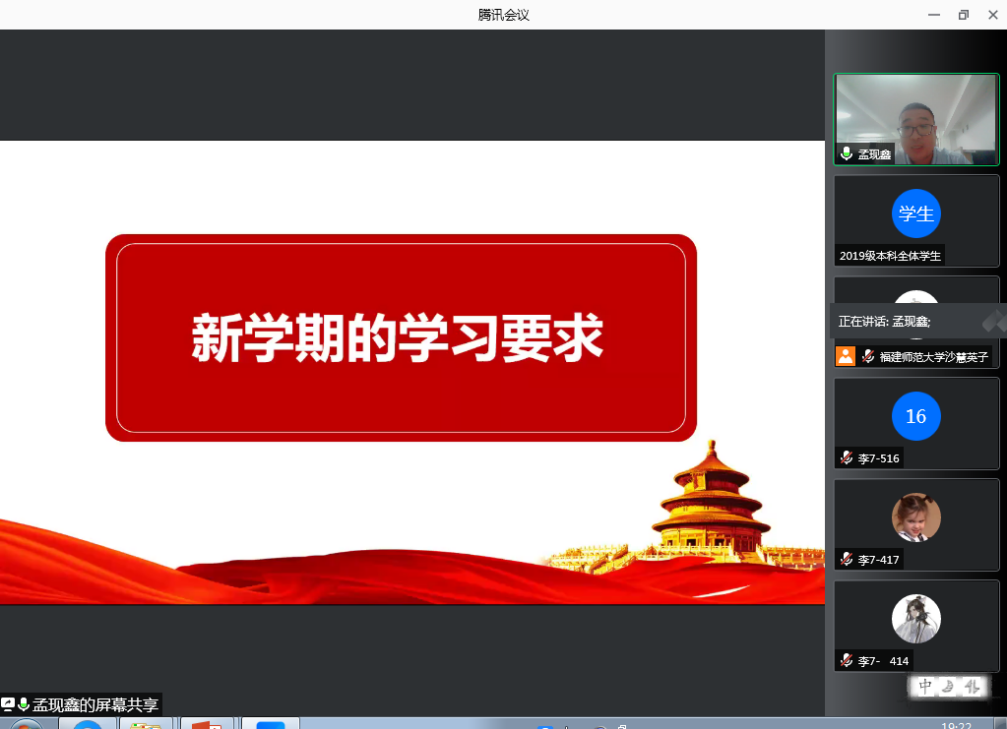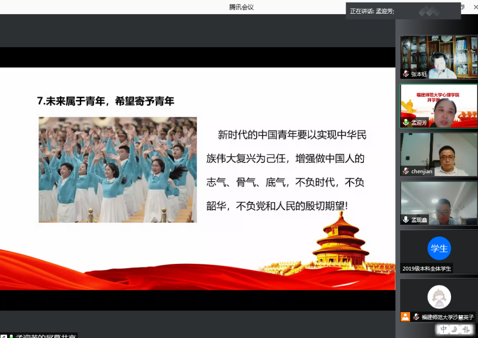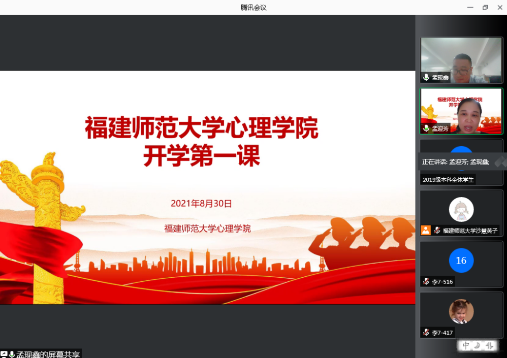 新学期开学在即,为深入贯彻习近平总书记“七一”重要讲话精神,紧紧围绕学校疫情防控常态化工作要求,以及日常教育教学及学生管理相关工作安排,2021年8月30日,我院通过线上线下相结合的方式开展了“开学第一课”,院党委副书记(主持工作)张本钰主持,副院长孟迎芳、应用心理学系主任陈坚、心理学系主任孟现鑫主讲,心理学院全体本科学生参与了此次活动。