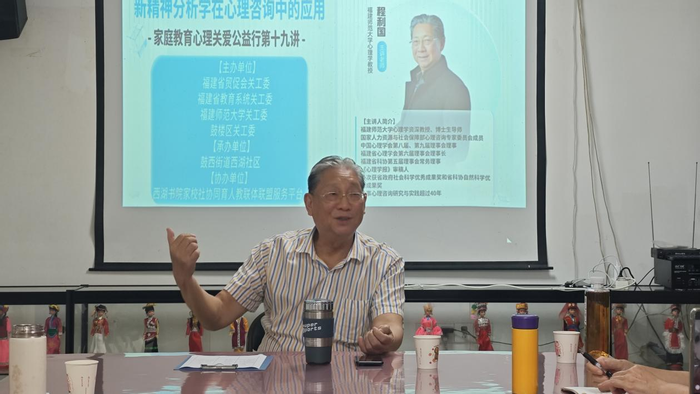 10 月 18 日,由我校关工委与省教育系统关工委及西湖社区等成立不到一年的“福州西湖书院家校社协同育人教联体”,举办家庭教育心理关爱公益行第十九讲。校关工委副主任、心理学院程利国教授与社区心理咨询工作者、社区居民代表,就家庭教育心理问题,用新精神分析方法,作了一天的讲座和互动交流。校关工委副主任、心理学院关工委主任叶建鸣参加了活动。本次讲座旨在为社区居民、心理学爱好者及心理咨询师、社会工作者搭建专业交流平台,助力解决家庭教育中的心理困惑,提升家庭心理关爱能力,普及家庭教育相关心理知识。
