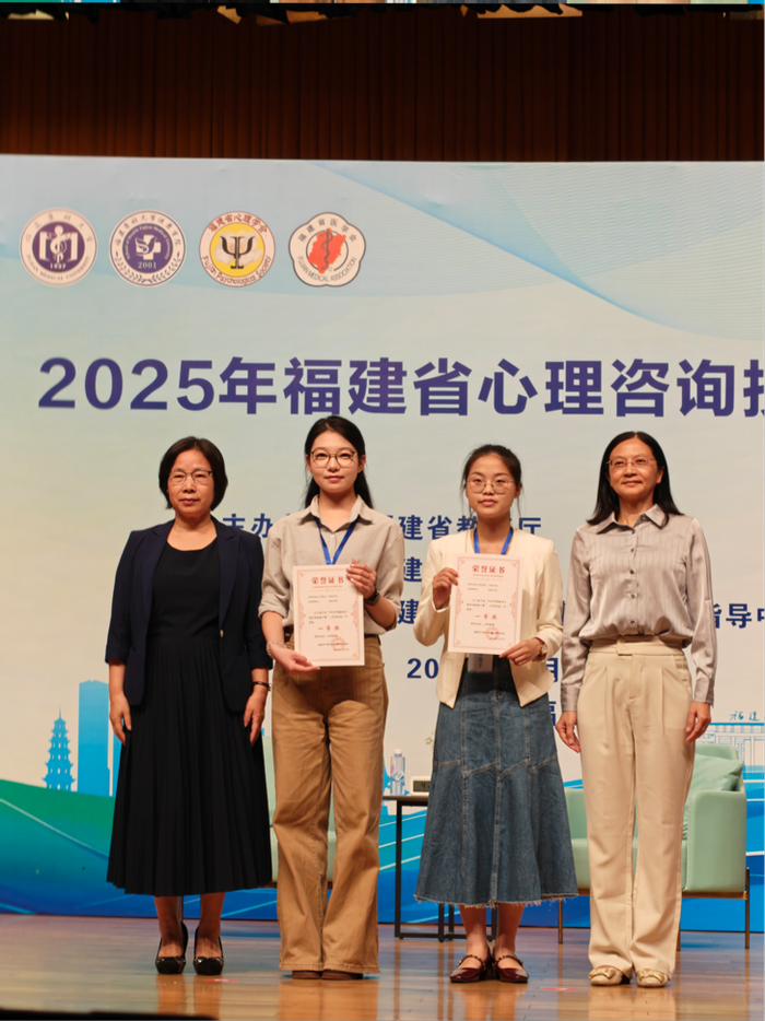 10月25日,由福建省教育厅主办的2025年度福建省心理咨询技能大赛决赛在福建医科大学圆满落幕。本次大赛设有研究生组、本科生组两个赛道,我院4名学子历经多轮选拔成功晋级决赛,最终不负众望,斩获一等奖1项、二等奖1项、三等奖2项的优异成绩。