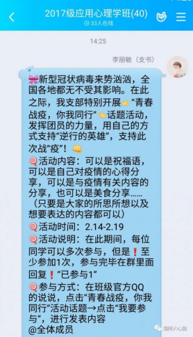 在特殊时期,我院利用网络平台抓好常规活动,以智慧团建线上平台和微信公众号为主,QQ、微博、微信群等多种网络平台为辅。各支部通过智慧团建平台稳步开展常规的“三会一课”,活动报名率达到70%,同时,结合其它平台助力团员更好地进行学习,例如发起防控期间感想和贴士的线上分享等。加强防控知识宣传普及,引导师生科学理性认识肺炎疫情,不信谣,不传谣,消除恐慌情绪,营造积极向上的舆论氛围。