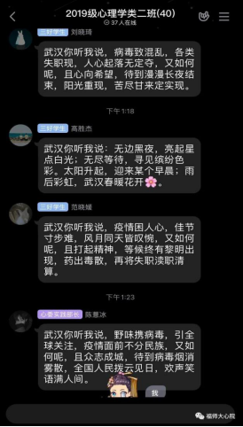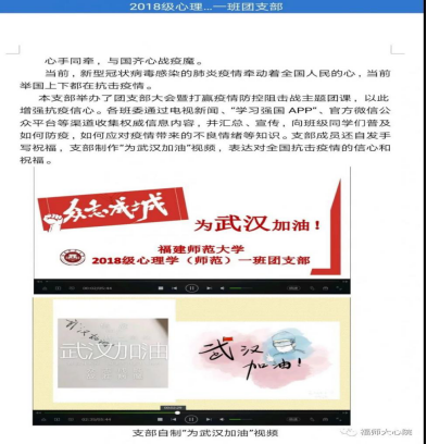 在做好常规的同时,我院团委开展“同心战疫,众爱成城”主题活动,号召各支部开展别具特色的支部活动。学院团委在线上每日分享各类防疫知识以及心理健康知识,推送“同心战疫,众爱成城”抗击疫情一线的志愿者风采系列宣传活动,大力宣传团员青年们在志愿活动中为防疫贡献的力量。各团支部也围绕着 “团聚青年同同战‘疫’共克时艰做贡献” 开展了特色网络主题团支部活动,如2019级心理学类二班团支部发起“写诗传爱武汉”活动,通过诗句接龙的形式,将自己对武汉同胞的关爱和祝福写下并分享。2019级心理学类一班团支部发起“以心为壤,抗疫花开”疫情防控分享会,分享关于防控疫情的小知识,以视频为载体加深同学们对疫情的了解。2017级心理学(师范)班团支部拍摄视频《我把家乡话说给你听——武汉加油!中国加油!》,声援武汉,共克疫情。