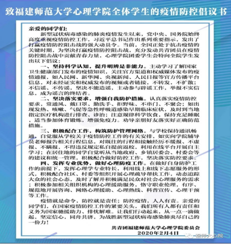 我院团委发布《致福建师范大学心理学院全体学生的疫情防控倡议书》等通知文件,号召广大心理学院学子,在做好自身防护工作的前提下,发挥心理学专业特长,利用线上和线下志愿服务的形式,积极配合社区、村委会等组织开展心理疏导帮扶工作,动态追踪大众的社会心态,及时了解并积极满足民众对社会心理服务的需求;积极参加相关组织机构的心理援助服务,恪守职业伦理,有序、规范地开展咨询、网络心理援助、心理热线、科普宣传、心理干预等工作。截止目前,全院共有123人参与疫情防控志愿服务,在防疫路上,贡献青春力量!