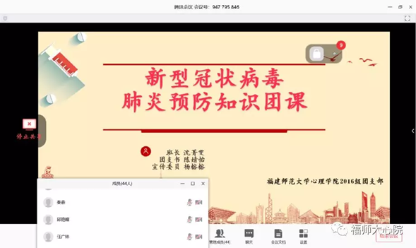 2020年初的这场始料未及的疫情让我们感受到的不仅仅是焦躁不安,还有最美“逆行者”带给我们的温暖。为了让青年团员坚定防控信心,凝心聚力抗疫,2020年2月11日我院2016级心理学班团支部利用腾讯会议APP进行线上团课。