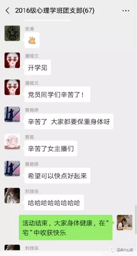 其中学生党员刘佳丽为同学们分享关于新型冠状病毒肺炎的学习成果。在党员代表号召为疫情献力后,同学们在微信群上表达了自己的感谢和祝愿。通过思想引领,相信会有更多的青年团员积极行动起来。疫情就是命令,防控就是责任。