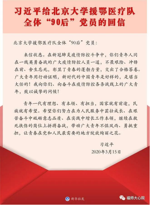 在新冠肺炎疫情这场“大考”面前,我们90后党员们也主动担起了抗击疫情的责任,在各种志愿服务岗位上为疫情的防控贡献着自己的一份力量。习近平总书记给北大援鄂医疗队“90后”党员的回信,突显了以习近平同志为核心的党中央对青年一代的重视,对于我们来说,它就像是一针强心剂,深刻鼓励着为我们青年党员建功新时代的昂扬斗志。作为新时代青年,我们理应把握住时代传递过来的接力棒,挺身而出,永远保持不褪色的家国情怀初心,永远保持不掉队的战斗姿态,永远保持不满足的学习精神,用自己的行动实践使命担当,做到“树立远大理想、热爱伟大祖国、担当时代责任、勇于砥砺奋斗、练就过硬本领、锤炼品德修为”,不辜负这个伟大的时代。
