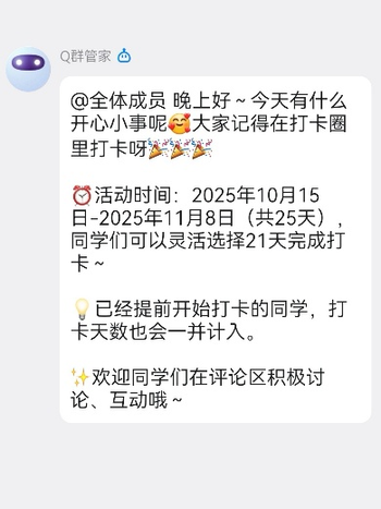 为响应国家卫生健康委在《关于开展2025 年世界精神卫生日宣传活动的通知》中人人享有心理健康服务的号召,帮助同学们养成积极乐观的思维方式,以更加饱满、向上的心态面对学习与生活,我院心理健康部于2025年10月15日至11月8日在线上开展“心记美好,向暖而行”打卡活动,共计25天,如今已圆满落幕。