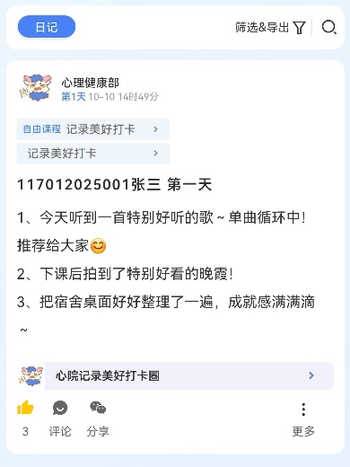 活动期间,参与同学需要每天记录下三件为自己带来积极情绪的小事,并通过微信小程序“圈子打卡”进行上传分享。每天,活动群内都会发送温馨的问候,提醒同学们回顾当天发生的开心小事,并完成打卡记录。此次活动累计有112人参与,在“圈子打卡”中产生的日记数量超2000篇,这不仅体现了同学们的高度参与,更汇聚了无数美好的生活瞬间。