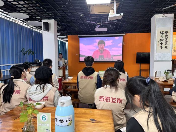 活动当日早晨,支部成员准时集合抵达餐厅,换上志愿者马甲后,负责人老师带领同学们一起观看了雨花斋成立发展纪录片,深入了解到这一免费为老年群体提供素食的公益平台,凭借爱心人士与义工的长期坚守已走过多个春秋,累计送出数百万份爱心午餐。纪录片中长辈们的满足笑容,让全体成员更深刻地领会到此次志愿服务的意义与价值,坚定了用心服务的信念。