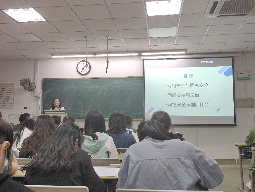 通过引导同学们对“网络给我们生活带来的利与弊”这一问题的探讨,王丽君老师从“网络安全与国家安全、网络安全与法治、网络安全与国际社会”这三方面与同学们进行交流。