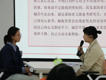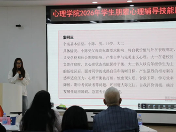 在学生朋辈心理辅导技能展示环节,选手们依次登台,通过3分钟案例分析与7分钟模拟辅导,运用倾听、共情等技巧应对模拟案例,展现扎实的心理学专业功底与助人能力。
