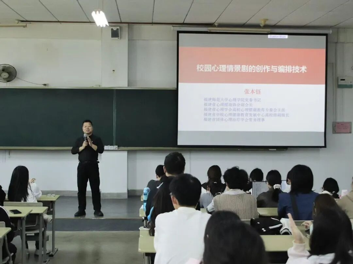 讲座开始,张本钰书记以心理情景剧的定义、由来以及剧理论的概念引入,通过并且以具体示例事例引导同学们从真实生活出发,从选题构思、创作技巧、剧本打磨、场景布置等核心内容展开,每一个环节都进行细致讲解与示范。同时,他鼓励大家用真诚的故事、自然的表演,展现当代大学生的内心世界,让作品更具感染力与真实性。