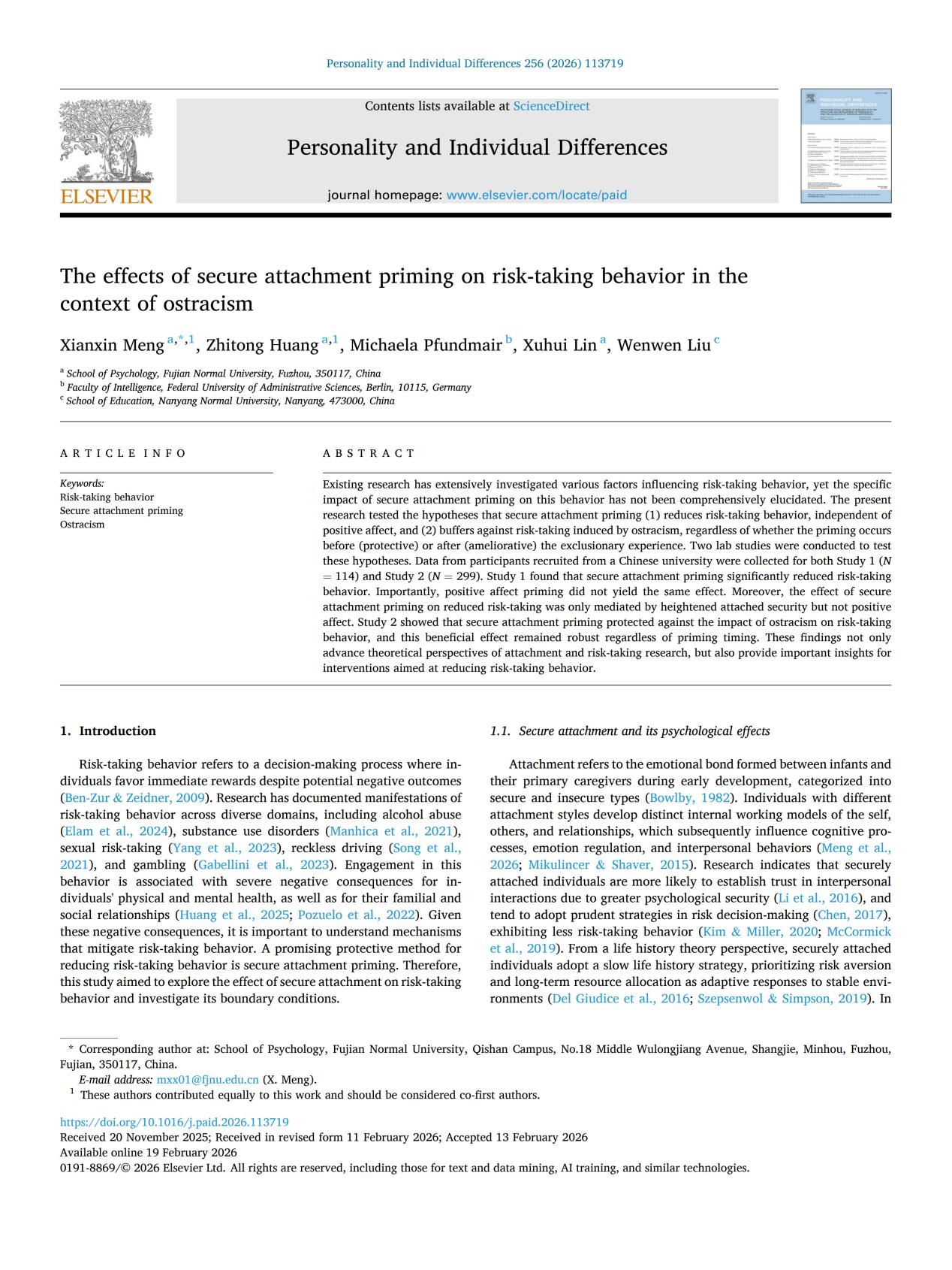 Meng, X., Huang, Z., Pfundmair, M., Lin, X., & Liu, W. (2026). The effects of secure attachment priming on risk-taking behavior in the context of ostracism. Personality and Individual Differences, 256, 113719. https://doi.org/10.1016/j.paid.2026.113719