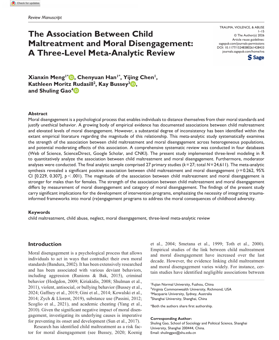 Meng, X., Han, C., Chen, Y., Rudasill, K. M., Bussey, K., & Gao, S. (2026). The Association Between Child Maltreatment and Moral Disengagement: A Three-Level Meta-Analytic Review. Trauma, Violence, & Abuse, DOI: 10.1177/15248380261428433.