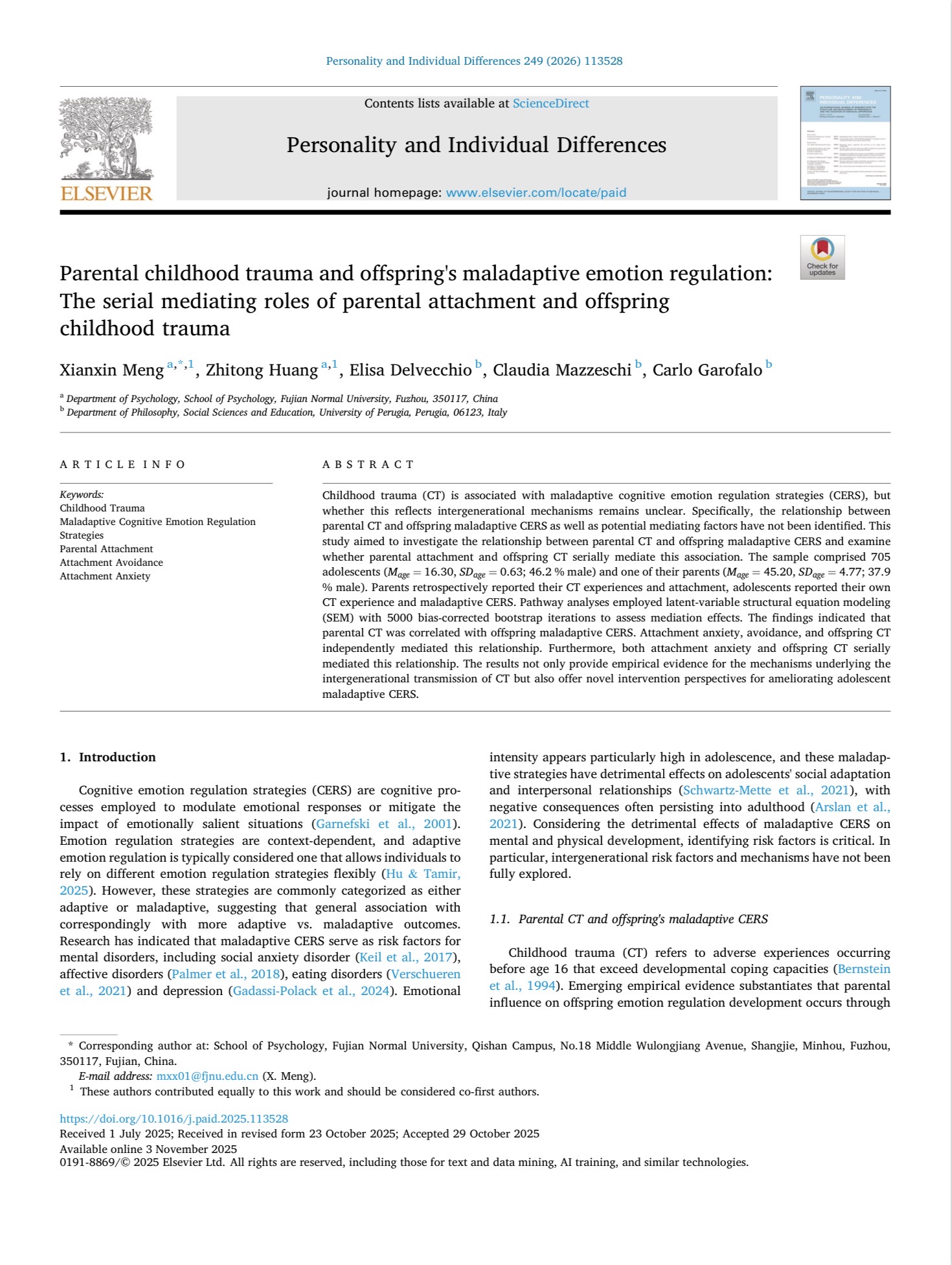 Meng, X., Huang, Z., Delvecchio, E., Mazzeschi, C., & Garofalo, C. (2026). Parental childhood trauma and offspring's maladaptive emotion regulation: The serial mediating roles of parental attachment and offspring childhood trauma. Personality and Individual Differences, 249, 113528. https://doi.org/10.1016/j.paid.2025.113528