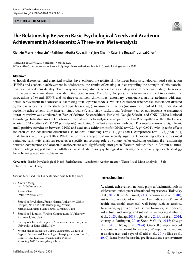 Meng, X., Liu, H., Rudasill, K. M., Chen, Y., Buzzai, C., & Chen, J. (2026). The Relationship Between Basic Psychological Needs and Academic Achievement in Adolescents: A Three-level Meta-analysis. Journal of Youth and Adolescence. https://doi.org/10.1007/s10964-026-02341-w