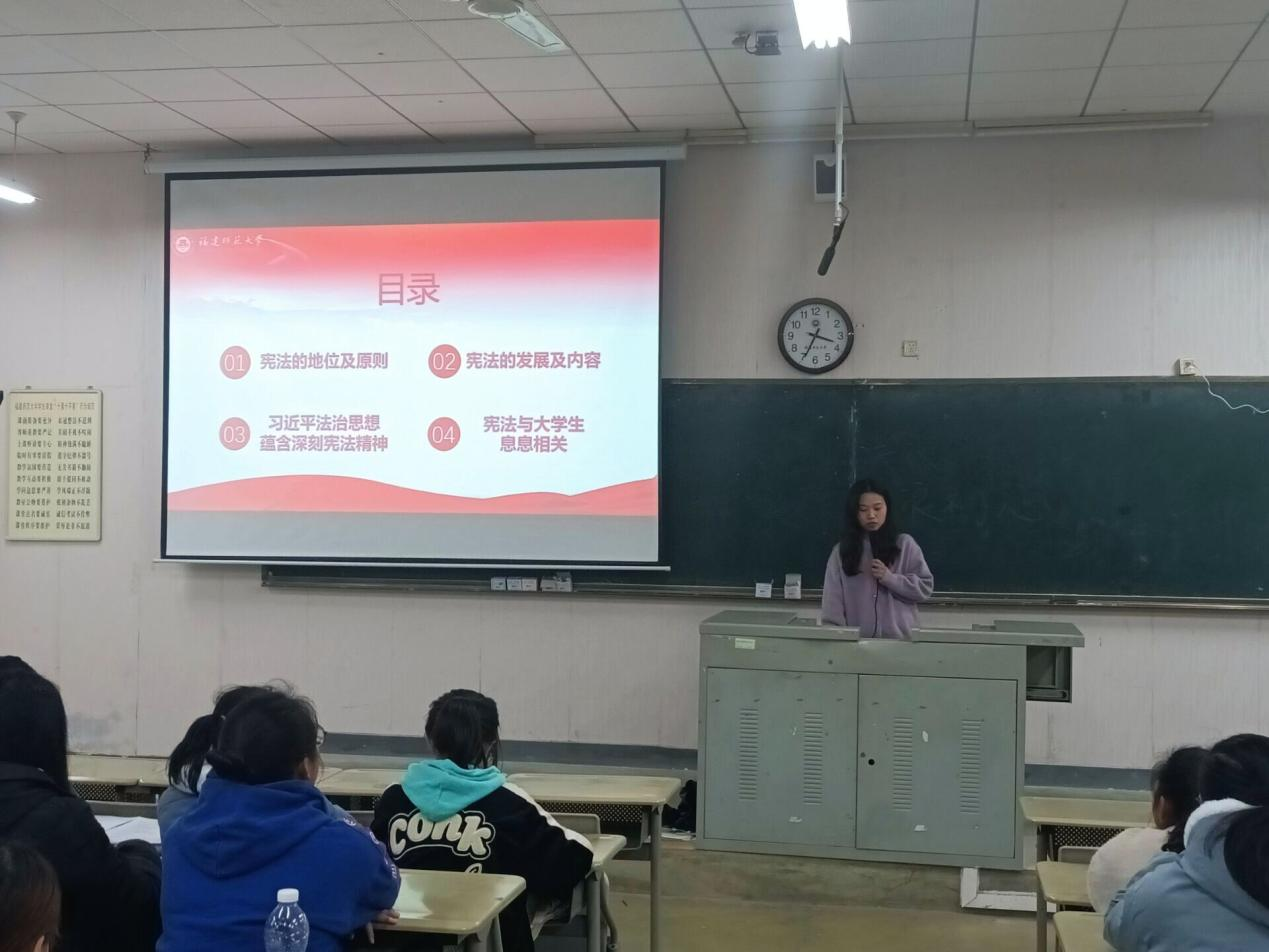 “宪法法律的权威源自人民的内心拥护和真诚信仰,加强宪法学习宣传教育是实施宪法的重要基础。”为帮助年级同学深入贯彻法治思想,更好地了解宪法,提高法制意识,领悟法治精神,我院2021级本科生辅导员李冬静老师于12月17日下午3点在知明1-104教室开展了一场“弘扬宪法精神,争做时代新人”专题教育活动。
