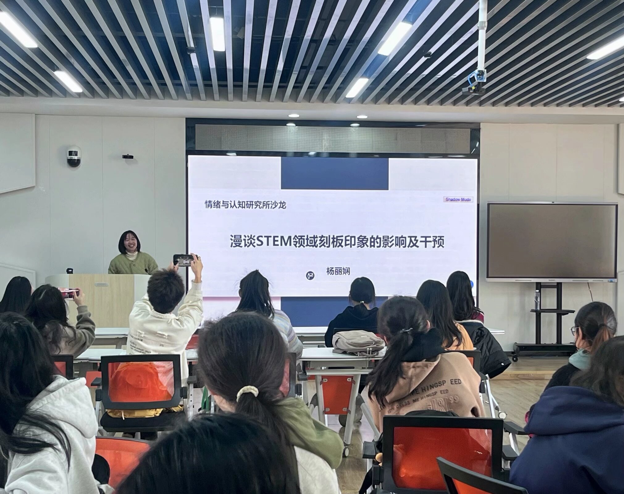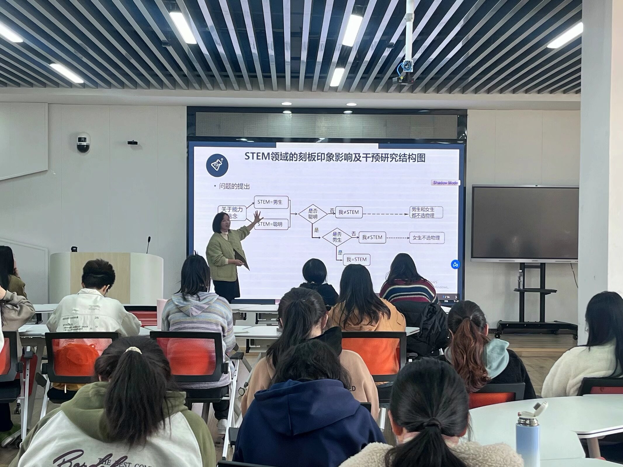 沙龙活动上,杨丽娴老师以当下时事热点中高考选科的男女倾向作为讲话的切入点,通过“男生就该选物理,女生就该选历史”这样的传统印象向同学们介绍了STEM领域的刻板印象在各方面的影响及干预措施,并向同学们展示了在该方面的研究成果和学术思想。