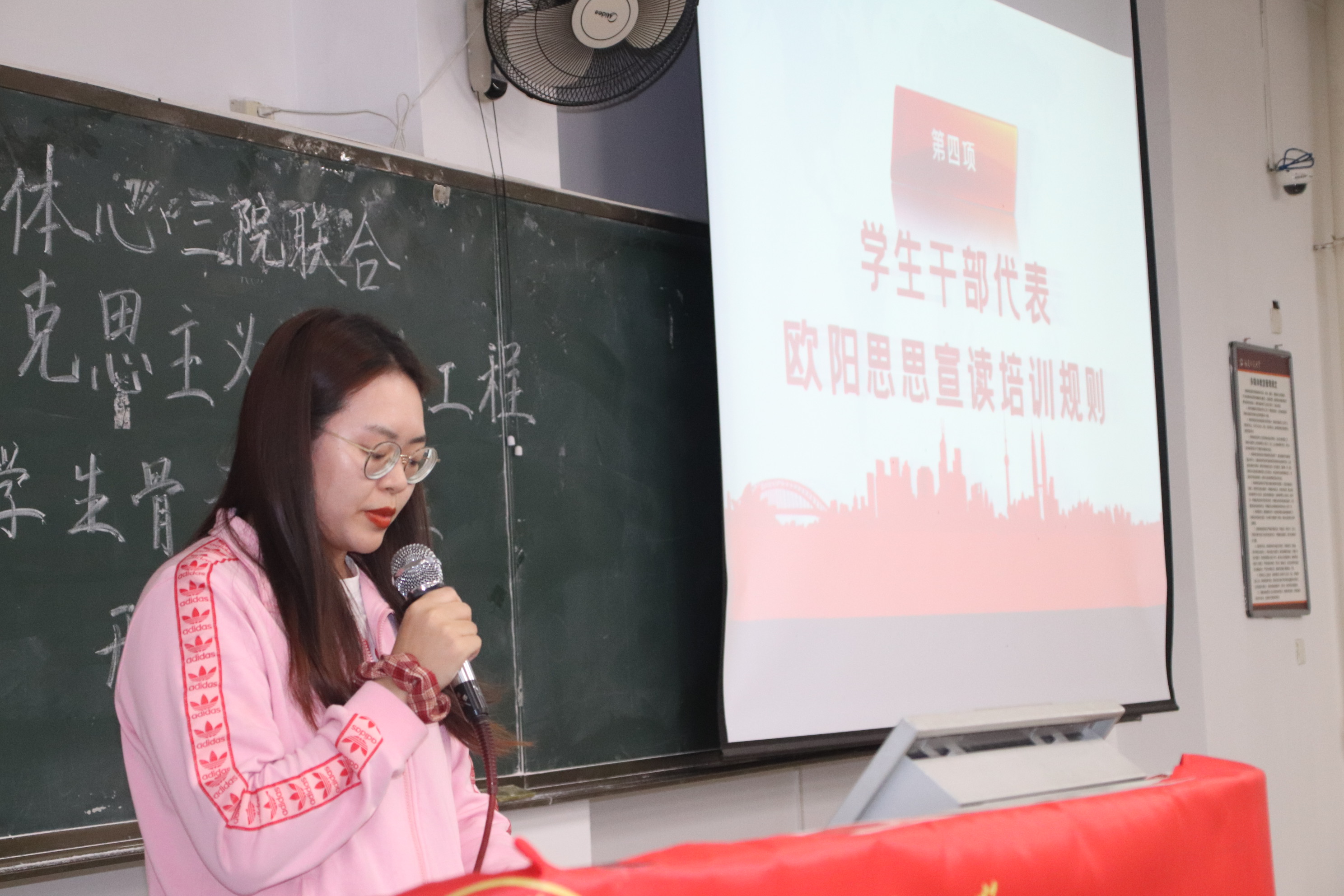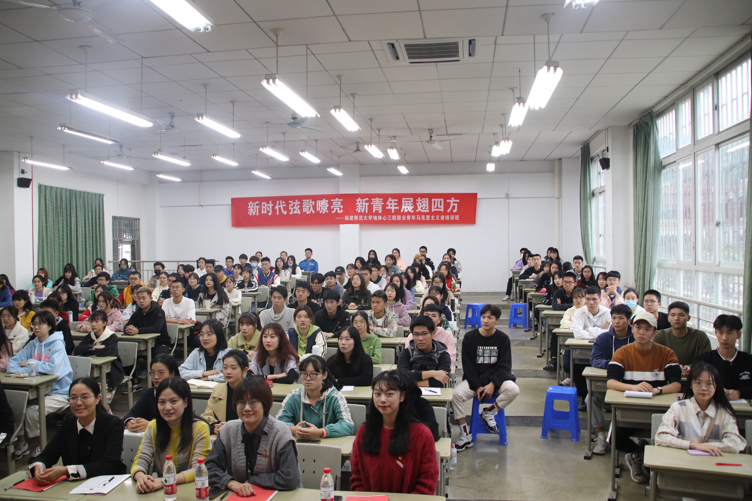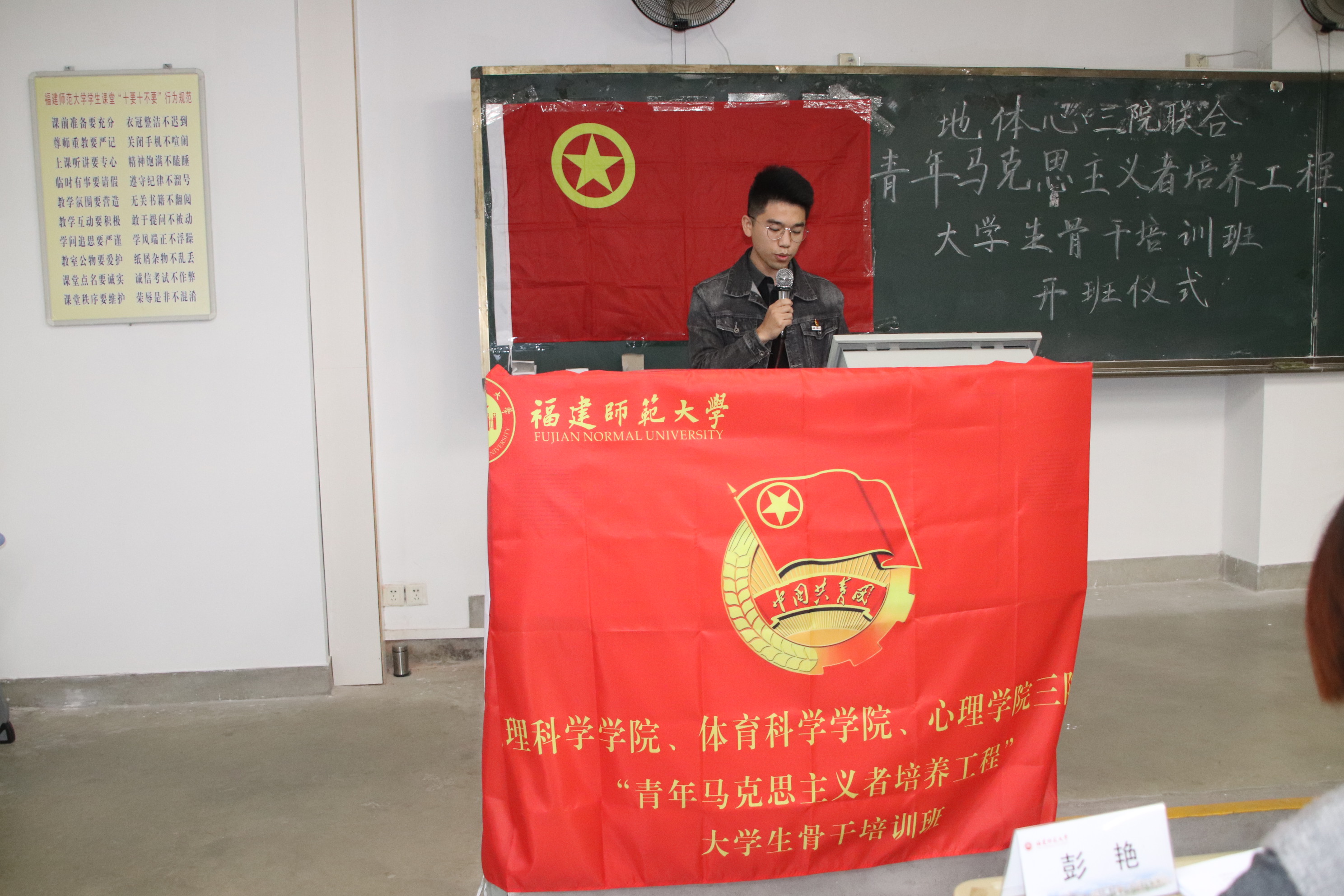 为贯彻落实习近平新时代中国特色社会主义思想,提升学生干部的创新精神与实践能力,11月28日下午,由地理科学学院、体育科学学院和我院三院联合举办的“青年马克思主义者培养工程”大学生骨干培训班开班仪式于致广1-108教室顺利进行。地理科学学院党委副书记曹裕虎老师、我院党委副书记张本钰老师、地理科学学院团委书记涂怡弘老师、体育科学学院团委书记彭艳老师和我院团委书记谢小芬老师出席本次开班仪式。仪式由洪沚妍同学主持,来自三个学院的学生干部共同参与。
