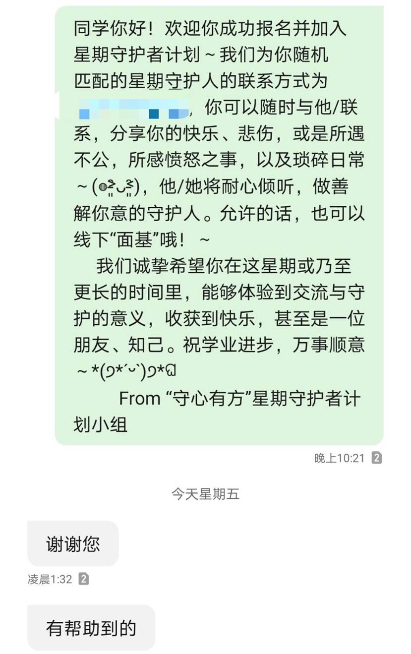 在团支书徐钰芬的策划与组织下,支部成员被分配到宣传小组、账号运营小组或数据处理小组中。宣传小组的成员们经过精心设计,通过合理的分工合作,为“星期守护者计划”与“高级树洞计划”制作了海报并写了推文,之后将海报与推文发给账号运营小组,由他们发到官方QQ账号“守心有方”上,提供同学们报名。与此同时,账号运营小组对于参与者的所有疑问进行了耐心的回答。而数据处理小组每天晚上都会将当天收集到的数据进行处理,为参与者随机分配“守护者”或“树洞”并向参与者发送短信通知所对应的匹配人的QQ或手机号。
