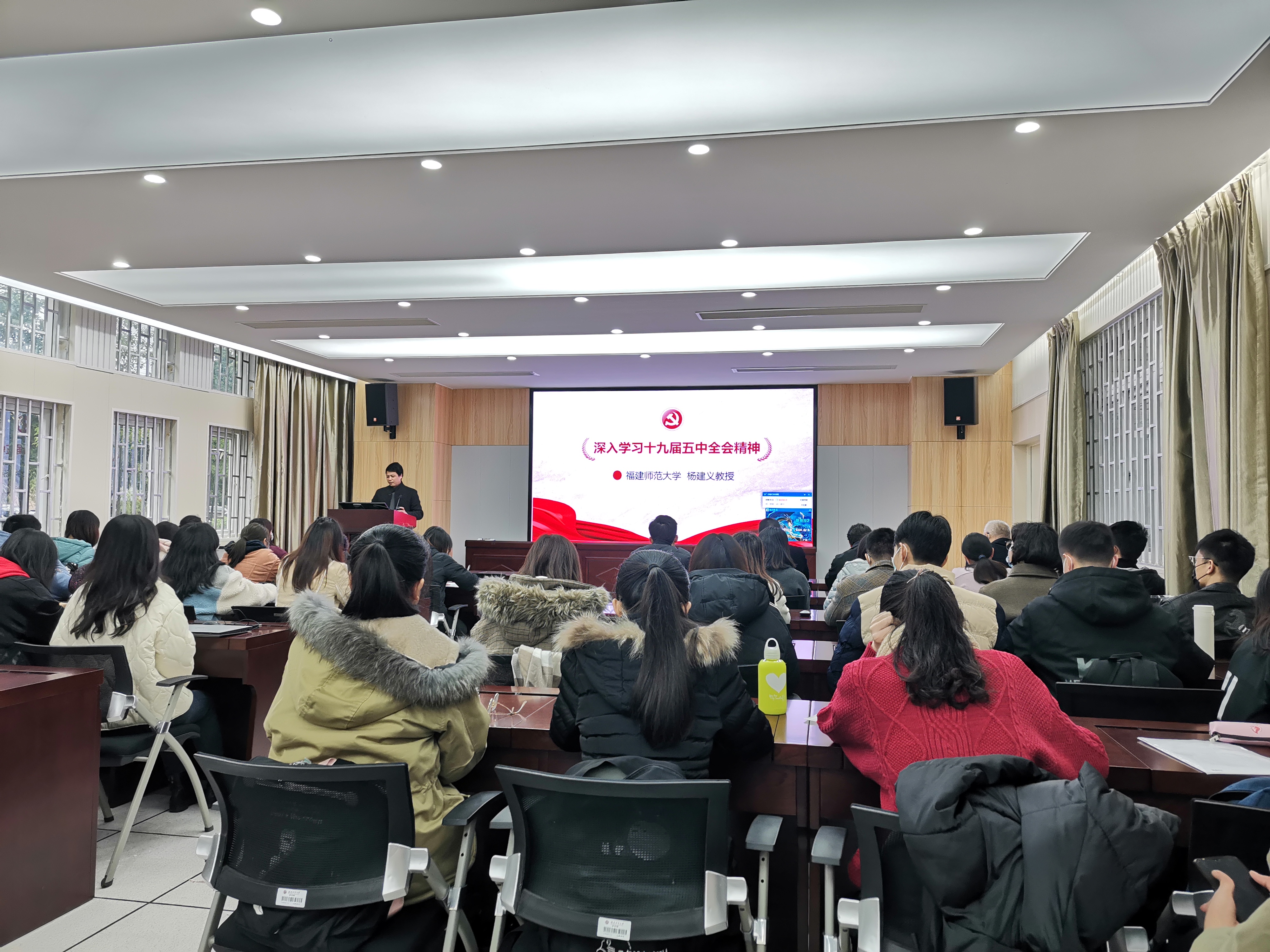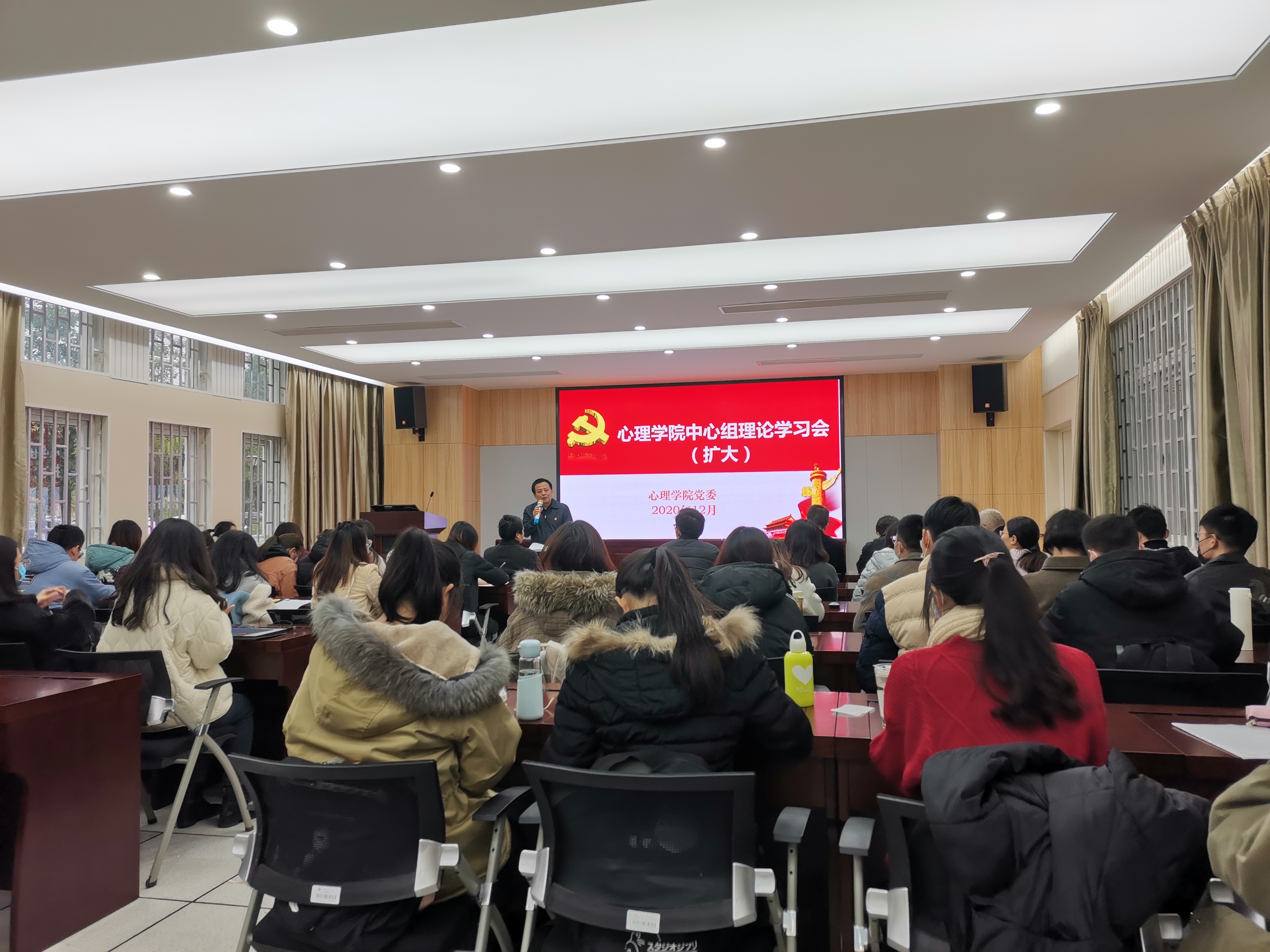 为深入学习领会党的十九届五中全会精神, 2020年12月16日,心理学院特邀校党委讲师团杨建义教授开展“深入学习党的十九届五中全会精神”讲座,讲座由学院党委张承东书记主持,学院全体师生党员到场聆听。
