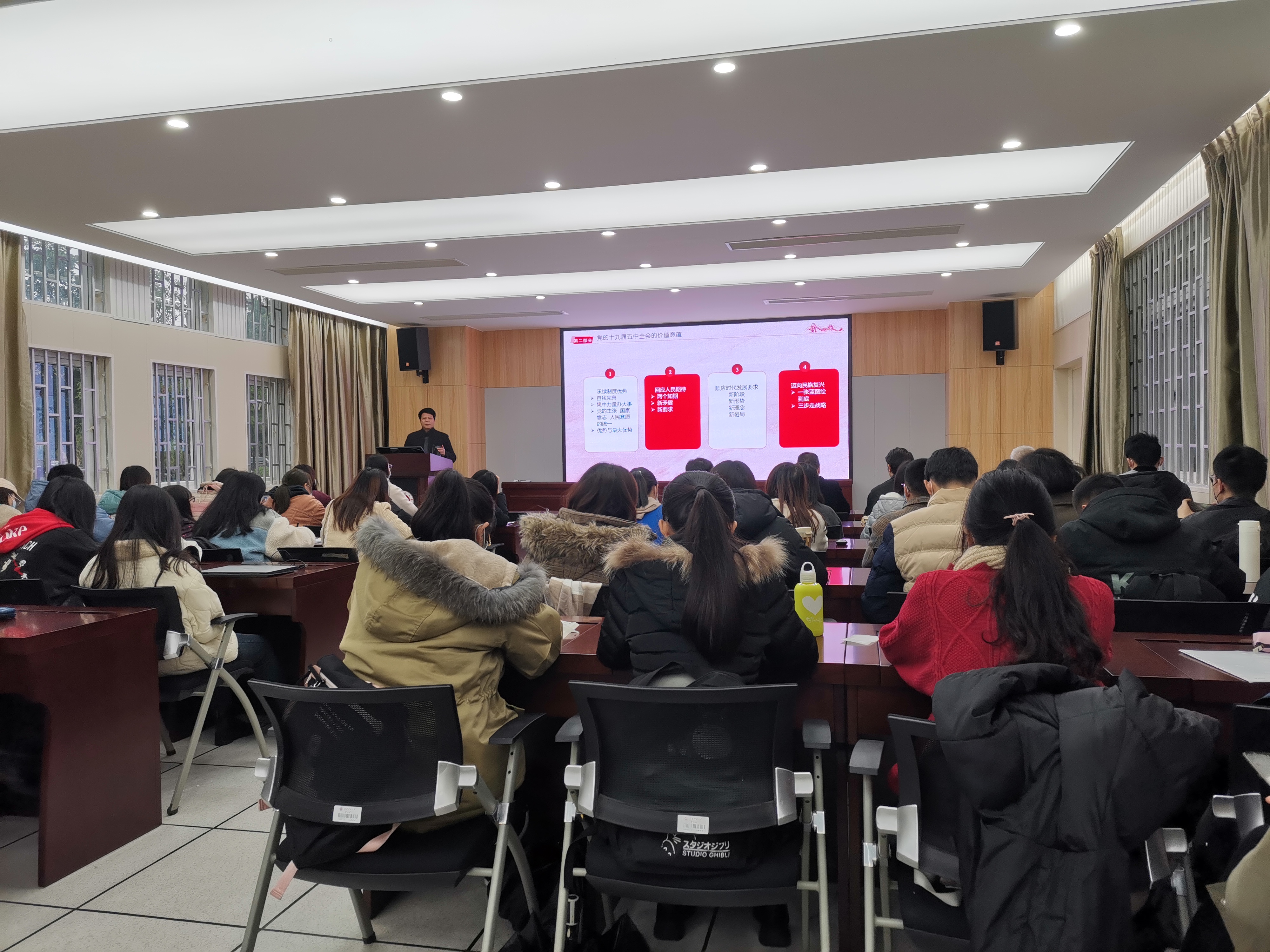 杨建义教授借助思维导图对党的十九届五中全会公报要点进行了详细阐述,以数字6、9、12为关键字讲解了“十四五”时期经济社会发展的主要目标、到二〇三五年要实现的远景目标以及实现奋斗目标的具体举措等。第二部分,杨教授以党的十九届五中全会的价值意蕴为核心话题,从承续制度优势、回应人民的期待、顺应时代发展的要求以及迈向民族复兴这四方面入手,引导全体党员进行了深刻的思考。